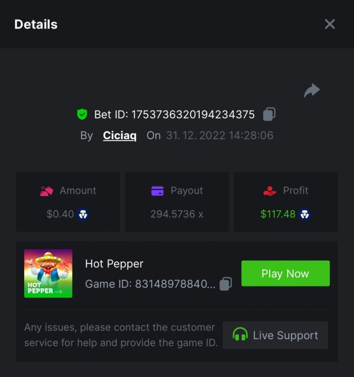 18. Aztec Fire - 180.95x https://bc.game/#/sd/10ZQ86YI56HFDF Sun of Egypt 3 - 95x https://bc.game/#/sd/10ZMOPVL148X77 Sticky Piggy - 220.25x https://bc.game/#/sd/10ZNWQJ1OELQ8J Big Heist - 392x https://bc.game/#/sd/10ZLSZEBAY239V Green Chilli - 138x https://bc.game/#/sd/10ZP76MH4GKO43