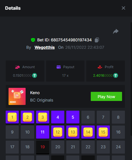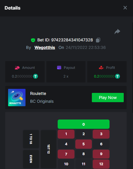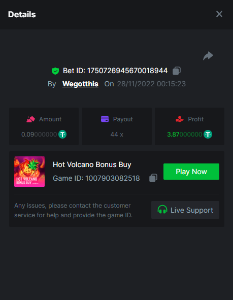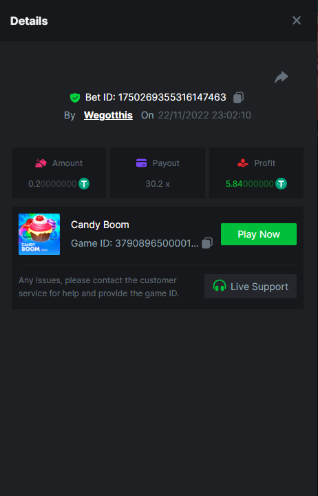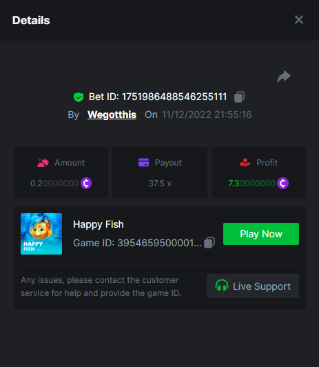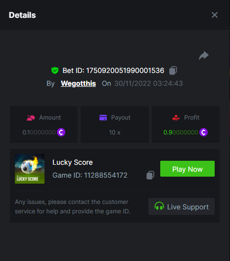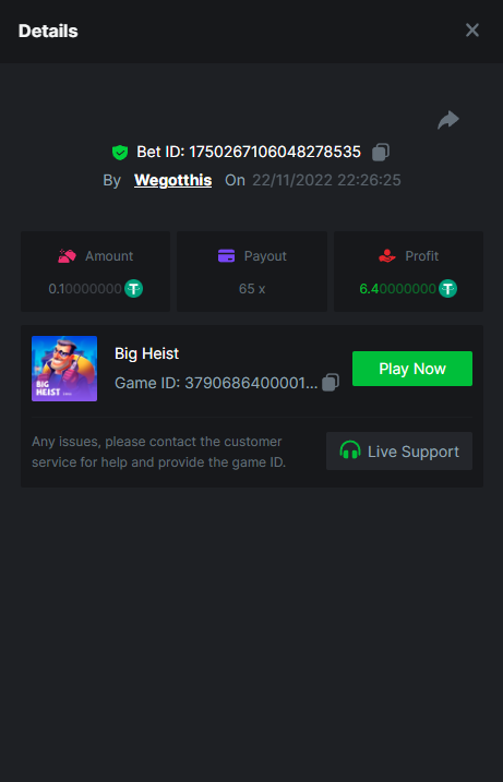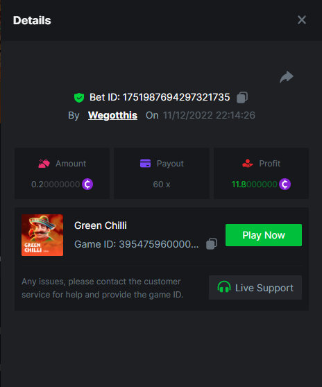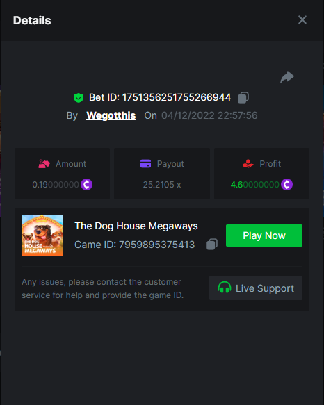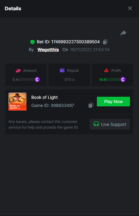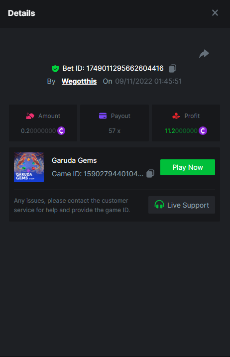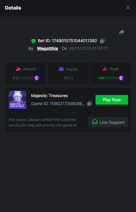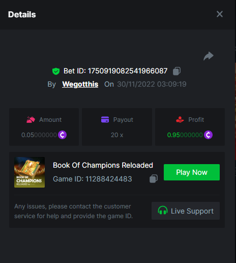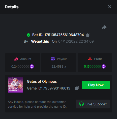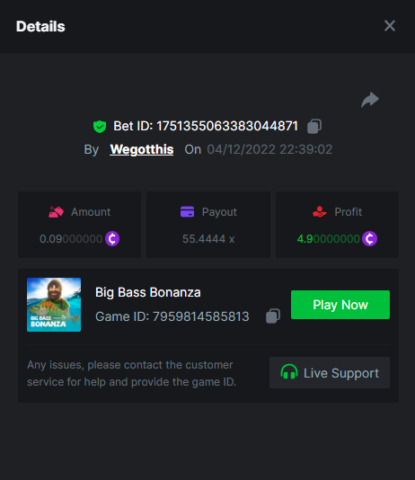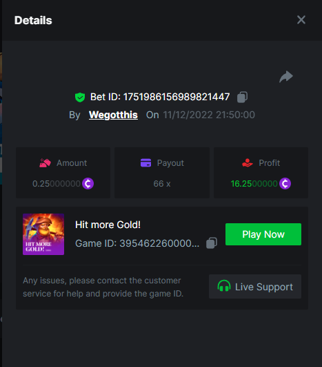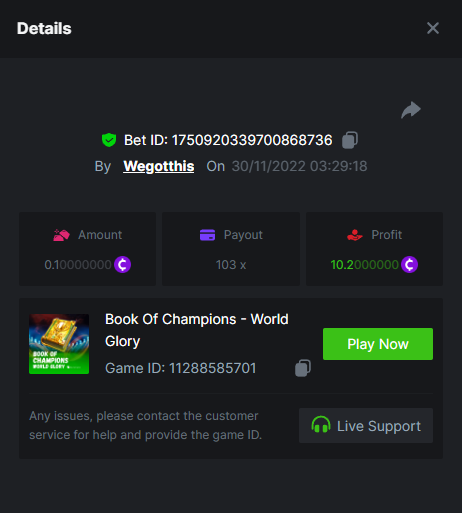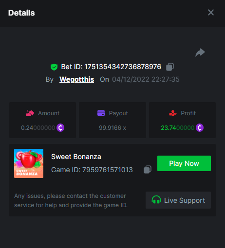 https://bc.game/#/sd/10YLHMO9FMMHW3 https://bc.game/#/sd/10YLI16E0IO0LV https://bc.game/#/sd/10YLIEX5ZDW9OZ I don't know why the bet ID shows 1 cent less per bet, while it's 10 cents on the provider's page. This would have made me eligible for bounty with exactly 50x. Look at screenshot below for example. https://bc.game/#/sd/10YLIV09L2KW7N https://bc.game/#/sd/10YLJADSJL3L77 https://bc.game/#/sd/10YLJI9Y61ZCIB https://bc.game/#/sd/10YLJVIP8441ZN https://bc.game/#/sd/10YLK4I9DYJAJ7 -