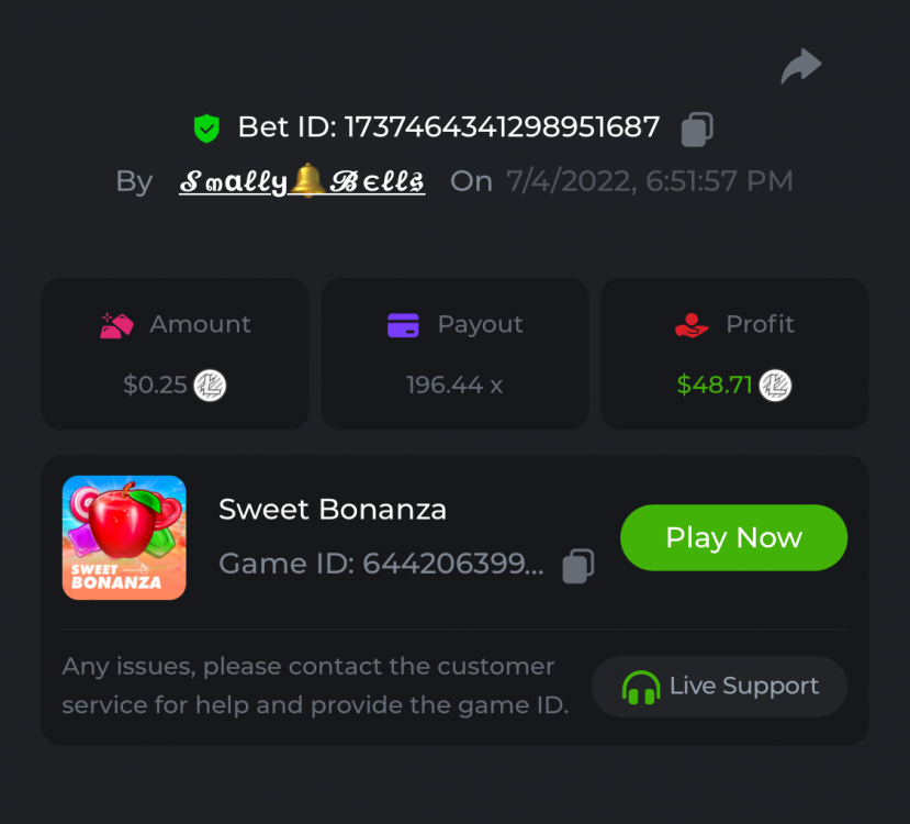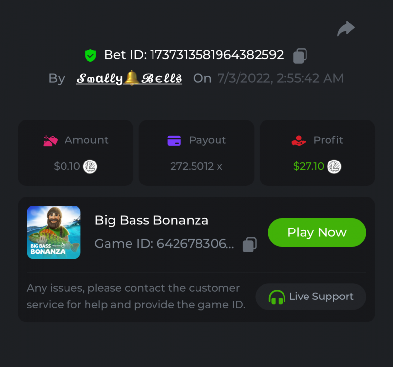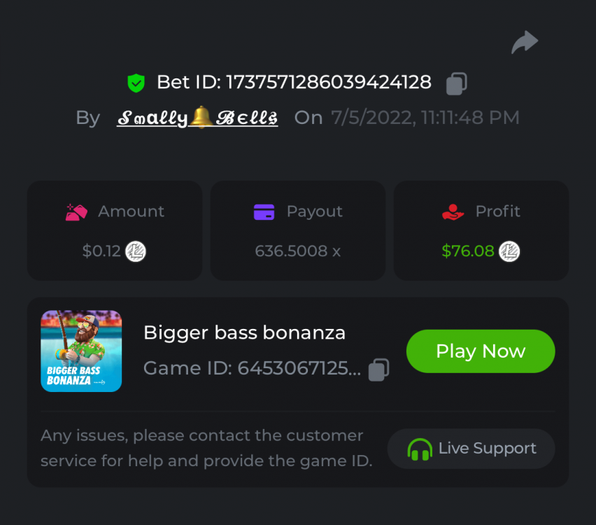 1. Sweet Bonanza: 196.44x https://hash.game/sd/?sd=10O1L1AME2AO0J Gates of Olympus: 360x https://hash.game/sd/?sd=10NXINXXM5HPUB Big Bass Bonanza: 272.5x https://hash.game/sd/?sd=10NXGKI8MBUBYR Wild West Gold Megaways: 209.12x https://hash.game/sd/?sd=10NSHRFA3IZXG3 Bigger Bass Bonanza: 636.5x https://hash.game/sd/?sd=10O4IBZ1B94M4Z Sweet Bonanza Xmas: 423x https://hash.game/sd/?sd=10NSIW1H25RBBN Starlight Princess: 285.36x https://hash.game/sd/?sd=10NSBCSCJUJAJ7 Dog House Megaways: 415x https://hash.game/sd/?sd=10NTX8PH8UUHHV It doesn't matter for anything but just FYI in case it's reused - the prize pool table pic says "4rd place" lol Bounty: 50x (idk why its .0001x - LTC fluctuations maybe...was a $5.00 win on a $0.10 bet though) https://hash.game/sd/?sd=10NXOMAF8XVF2R