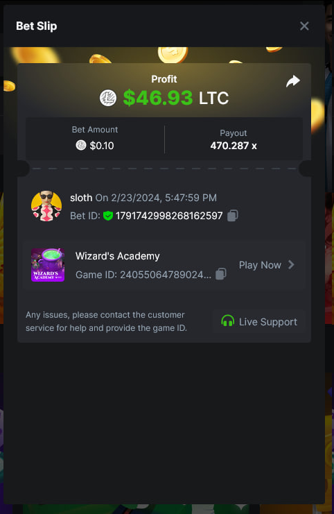 Wizard`s Academy - 470.287x https://bc.game/#/sd/11TA6BMYKQZBNZ Deadliest Sea - 244.1748X https://bc.game/#/sd/11TA2PER3KQ1EB Dragon Quest - 240.1733x https://bc.game/#/sd/11TA3E2NJCAHZN