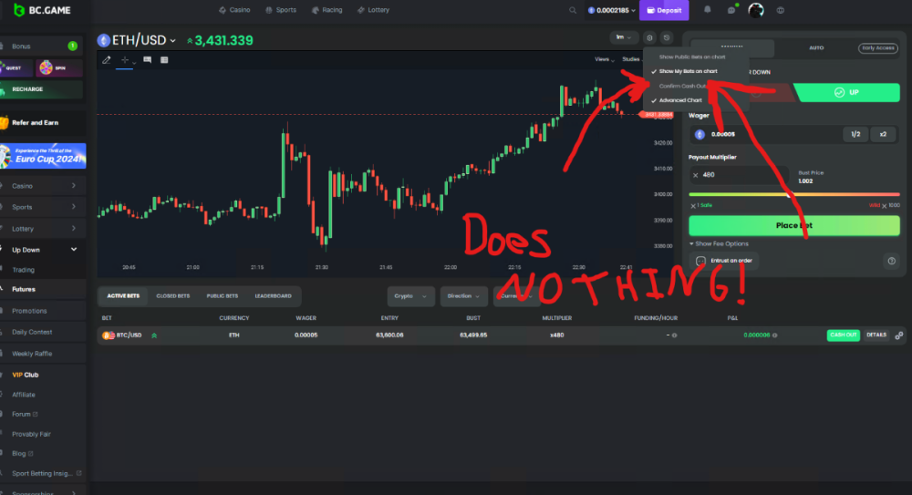Under "Up/Down" then "Futures" the setting to disable having to press 'cash out' THEN another button to confirm it, does not work.