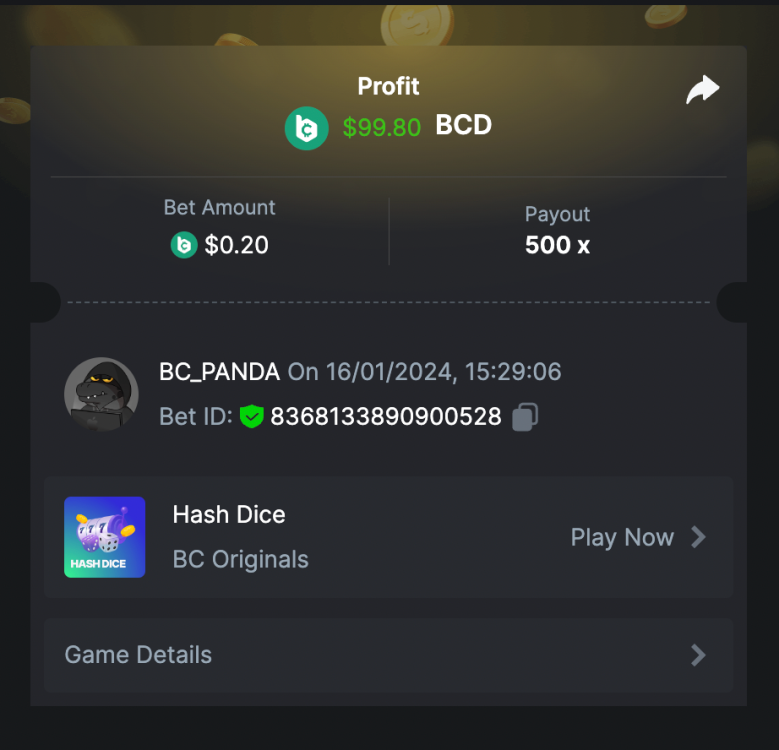 $5k Prestige Hash Dice Challenge #100 DURATION: 4th AUG - 11th AUG 12:30 pm UTC Greetings, esteemed VIPs! We are thrilled to extend our warmest welcome to each one of you. This week, we have an eagerly anticipated treat in store - the Hash Dice event, featuring an incredible prize pool of $5,000! The challenge is scheduled from 4th August to 11th August, commencing at 12:30 UTC. Kindly review the terms and conditions below attentively to grasp how you can partake in this exhilarating occasion. Wishing the best of luck to all participants! What's the Challenge? Complete as many of the following 20 payouts on Hash Dice. Must be a exact multiplier. | 22 | 33 | 44 | 55 | 66 | 77 | 88 | 99 | 111 | 222 | 333 | 444 | 555 | 666 | 777 | 888 | 999 | 1111 | 2222 | 3333 | Each payout you hit above counts as 1 point (Maximum 1 point for each payout). If there is a tie, the player with the higher average bet amount (in USD) shall be the winner. How to Enter To enter, copy the link of the bet you'd like to submit. Once you've copied it, paste it as a reply to this thread like so: Link: https://bc.game/#/sd/11F9I4D1YXDFFR In the same post, upload a screenshot of your win by clicking the game ID WITH VIEW IN USD mode ENABLED (accessible at the bottom of dropdown menu for your wallet up top. This way, we can ensure that your bet indeed met the minimum requirement at the time of placing it: Link: https://bc.game/#/sd/11F9I4D1YXDFFR Minimum VIP Minimum VIP 4 with phone verified will be eligible! Eligibility to Win Prize Win at least 3 payouts to qualify. Minimum Bet Size $0.15 equivalent Eligible Coins All cryptocurrencies are eligible (excepting JB) Available Prizes GENERAL TERMS Please combine all of your hits together in a SINGLE post. Edit your existing post for additional hits, don't create a new post. Each eligible entry must have the Bet Slip URL, failure to include it will disqualify participation in the event. Bet Slip image is not mandatory. Bets must be posted within 24 hours of placing bet in order to keep things fair for everyone. Bets must be made during the specified time window stated above. This thread will lock automatically when the time period is over. One (1) entry per household. Anyone found attempting to win multiple prizes will be disqualified from this challenge as well as all future challenges. Failure to follow instructions will result in your submission being null and void. By entering this challenge, you acknowledge that BC.Game has the final decision on results and placement. Payouts will be distributed after the event is finished. Please note that it could take anywhere between 24 hours to 7 days after the completion of the event.