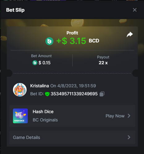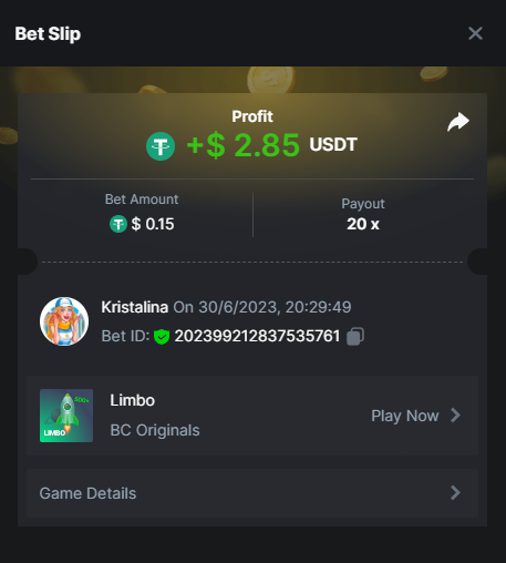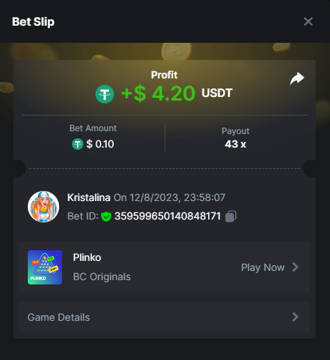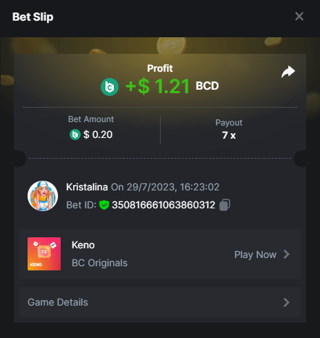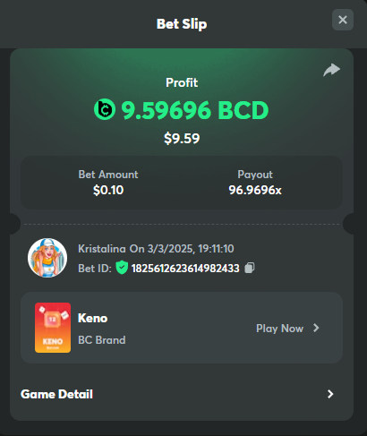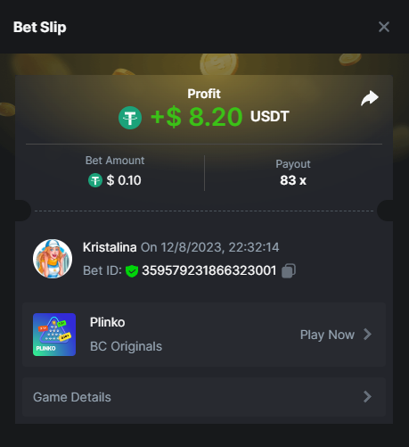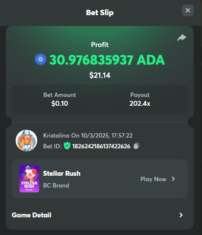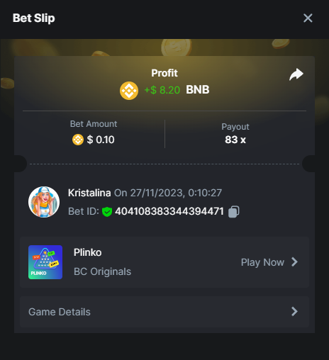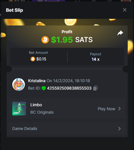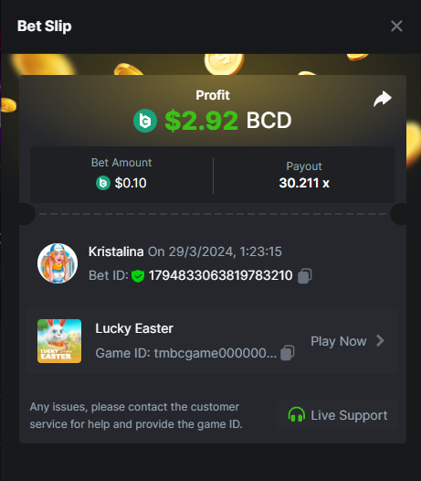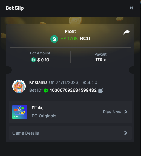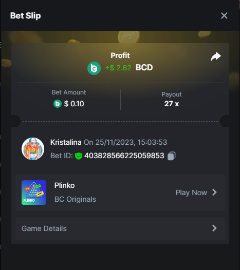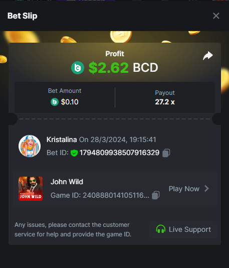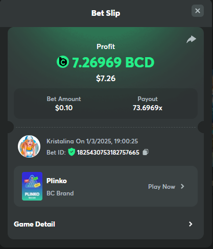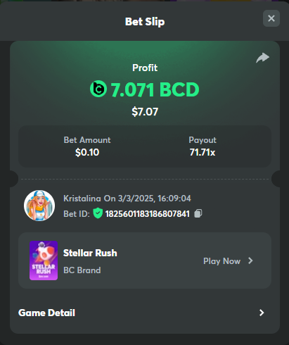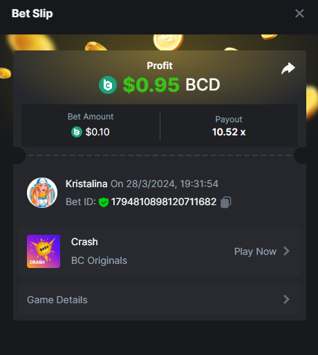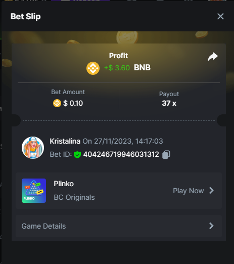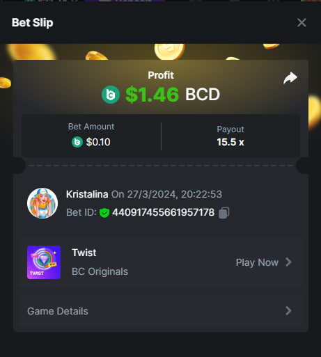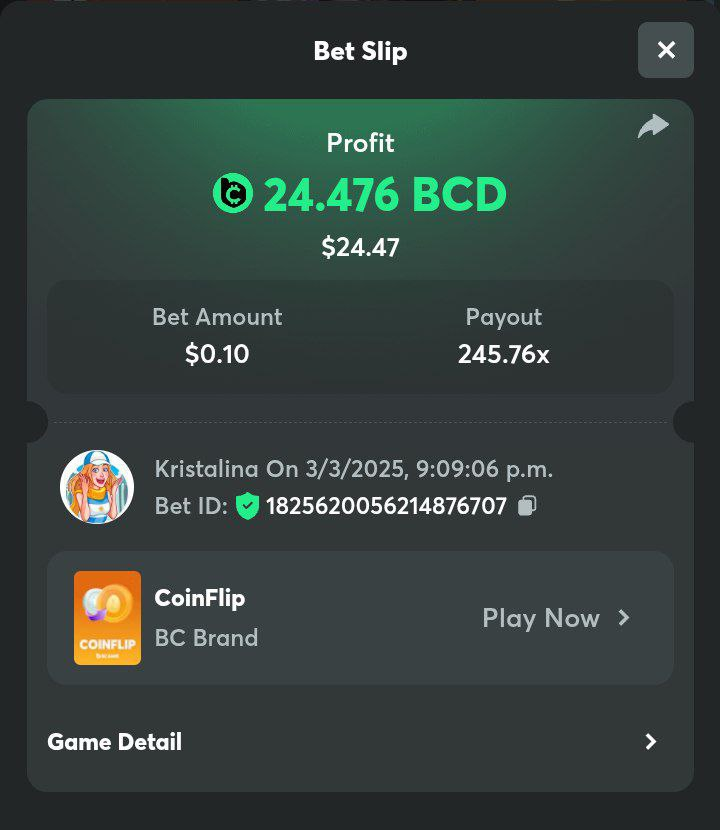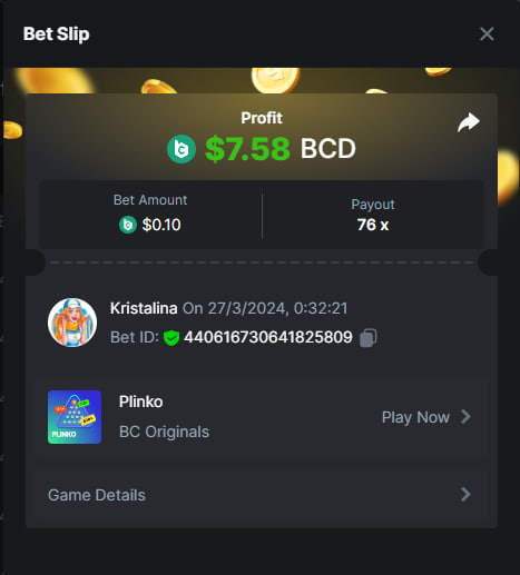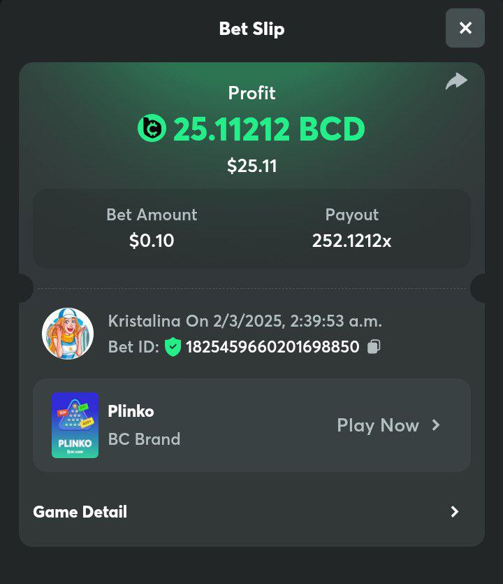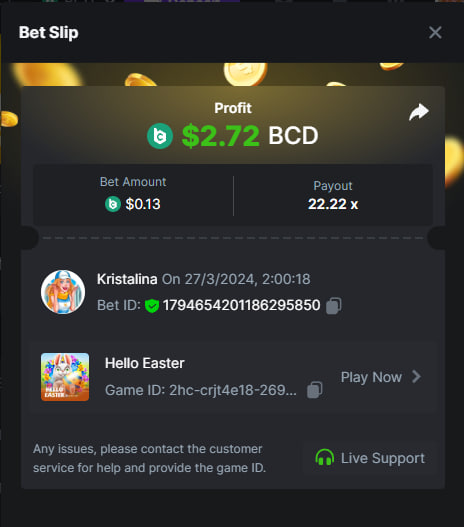 2. Easy 1. Deposit Txid: 4434113e293eb472a7b171d17fbe54cbfb34631824705869716f789ec0040181 2. Instagram: @LincesaMdq 3. Instagram Post: https://www.instagram.com/p/DHXgr4JspCP/?igsh=ZWgwenpqYXVreTF 4. Twitter: @Kristalinauwu 5. Like, retweet & tag: @Kristalinauwu https://x.com/Kristalinauwu/status/1901728054969274750 6. Follow BCGame Facebook: Gisela Gall 7. Limbo: https://bc.co/game-detail/1825513481832927011 8. Sports bet: Ticket ID: 2513820866270339253 9. Arabian Secret: https://bc.co/game-detail/1825439374915515681 10. Sugar Fiesta 1000: https://bc.co/game-detail/1825441146495751971 11. 2FA activated: Medium 1. Deposit TxID: 4d707ead402ff5771e270374a5fc42f5798fdc6bd13d6bf975996a5316cb53ff TxID: 39d9776a52287c2bdc8bea45c1a751ae618ef4976ed8907766ce39ac0603937f 2. Crash: https://bc.co/game-detail/1825546630112045702 3. Plinko: https://bc.co/game-detail/1825430753182757665 4. Roulette: https://bc.co/game-detail/1825527742035924514 5. Starshine Princess 1000: https://bc.co/game-detail/1825598330617384993 6. Stellar Rush: https://bc.co/game-detail/1825601183186807841 7. Keno: https://bc.co/game-detail/1825612623614982433 8: Poker Ways: https://bc.co/game-detail/1825547398747784483 9. Wukong: https://bc.co/game-detail/1825595350268898850 10. Lottery and Porsche tickets: 11. Sports bet Combo Ticket ID: 2512055034057994476 Hard 1. Wheel: https://bc.co/game-detail/1825529693239491107 2. Crash: https://bc.co/game-detail/1825774085023770502 3. CoinFlip: https://bc.online/game-detail/1825620056214876707 4. Stellar Rush: https://bc.co/game-detail/1826242186137422626 5. Plinko: https://bc.co/game-detail/1825459660201698850 6. Limbo: https://bc.online/game-detail/1826864347105905955 7. Hashdice: https://bc.online/game-detail/1826862839661034018 8. Sea of Olympus 1000: https://bc.co/game-detail/1825539068560977186 9. Gold of Olympus: https://bc.online/game-detail/1826344599486243619 10. Duck Hunter: https://bc.co/game-detail/1825605420251285539 11. Sports bet combo Ticket ID: 2513187573116055908