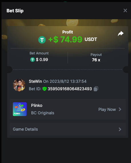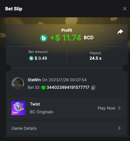 2. 2023/7/28 00:07:54 Bet ID: 344023994191577717 https://bc.game/#/sd/11ERVJ2IS8MJ2R