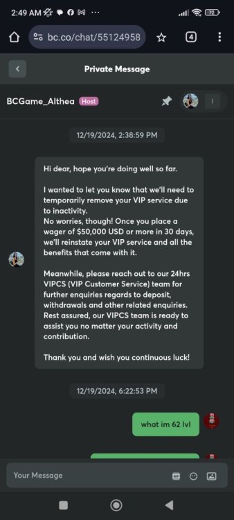 18. so i am level 62 i had vip host althea in month of november i had been inactive due to me suffering from covid when i came back to bcgames in december on 19th december i was messaged by my host that the vip serivce was being removed due to inactivity and will be reinstated once i wager 50000 usd or more i have wagered more than 50000 usd already within 30 days and i have not been reinstated with the host whenever i ask the vip support on live support they just copy paste the same new rules and when i pasted the screenshot of my vip host chat they said i will soon get the message from new host but till today i have not been given any host im attaching the screenshot of my vip host chat which she had messaged on 19th dec 2024 and after that the chat feature is gone from my bcgame ui im urging bcgame to reinstate or instate a new vip host to me. its already been so much time now , the live support have no idea on this matter,hence i am posting here