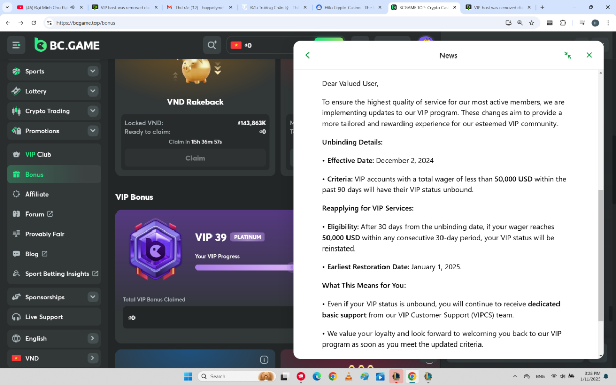 4. This is such a joke, In the news, It only mention users to reach VIP 38+ and 50000 USD wager within 30 days. My wager is 76k and now you tell me that I need to deposit more (not even mention) and wager more.