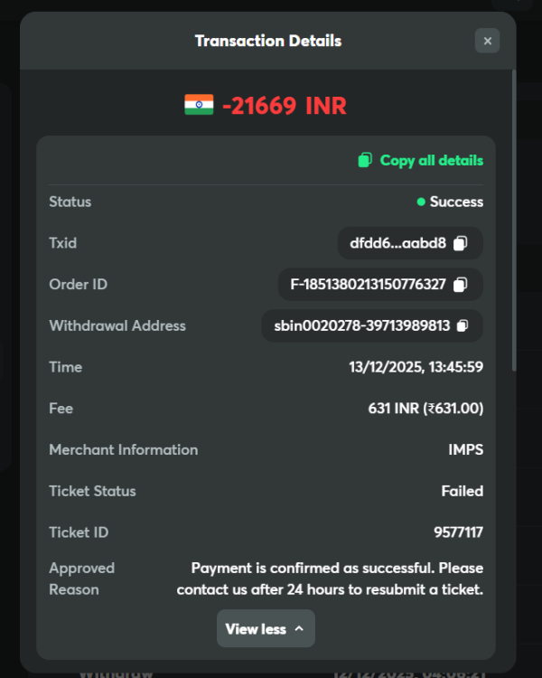 1. Hello BC.Game Team, I made a withdrawal of ₹21,669 which shows as SUCCESSFUL on BC.Game. Details: Amount: ₹21,669 Date: 13-Dec-2025 Bank: State Bank of India (SBI) I contacted my bank (SBI) and they confirmed that the amount has NOT been received. They asked me to request a bank-level trace or reversal from the sender. Kindly escalate this issue to the finance/payment gateway team and let me know: 1) Current status of the transaction 2) Whether it is pending or will be reversed 3) Expected timeline for resolution Thank you.