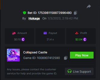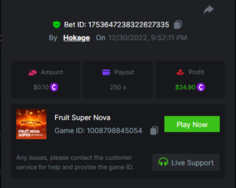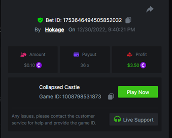 Treasure Snipres Christmas - 23.50x https://bc.game/#/sd/110C4S9TC9OHZN Christmas Reach Bonus Buys - 20.00x https://bc.game/#/sd/110C605YO03ZMB Ice Mania - 20.00x https://bc.game/#/sd/110C669DL8ABYR Collapsed Castle - 36.00x https://bc.game/#/sd/110C6M9RVXMHHV Fruit Super Nova - 250.00x https://bc.game/#/sd/110C7CHZQSBOYB -