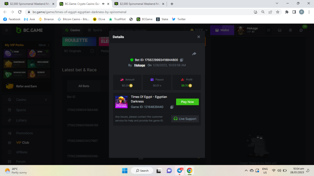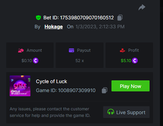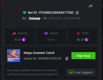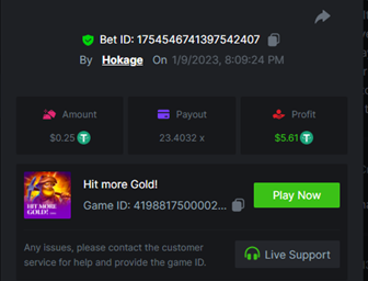 Wild Spin - 33.40x https://bc.game/#/sd/111RYOGM9KOMXF Dragon’s Element - 48.50x https://bc.game/#/sd/111RZ47WT3RUHF Aztec Coins - 10.64x https://bc.game/#/sd/111RZGYO40MADV Lucky Cat - 32.00x https://bc.game/#/sd/111S130ZWFVAJ7 Pirate’s Map - 15.00x https://bc.game/#/sd/111S1NTT490LJN