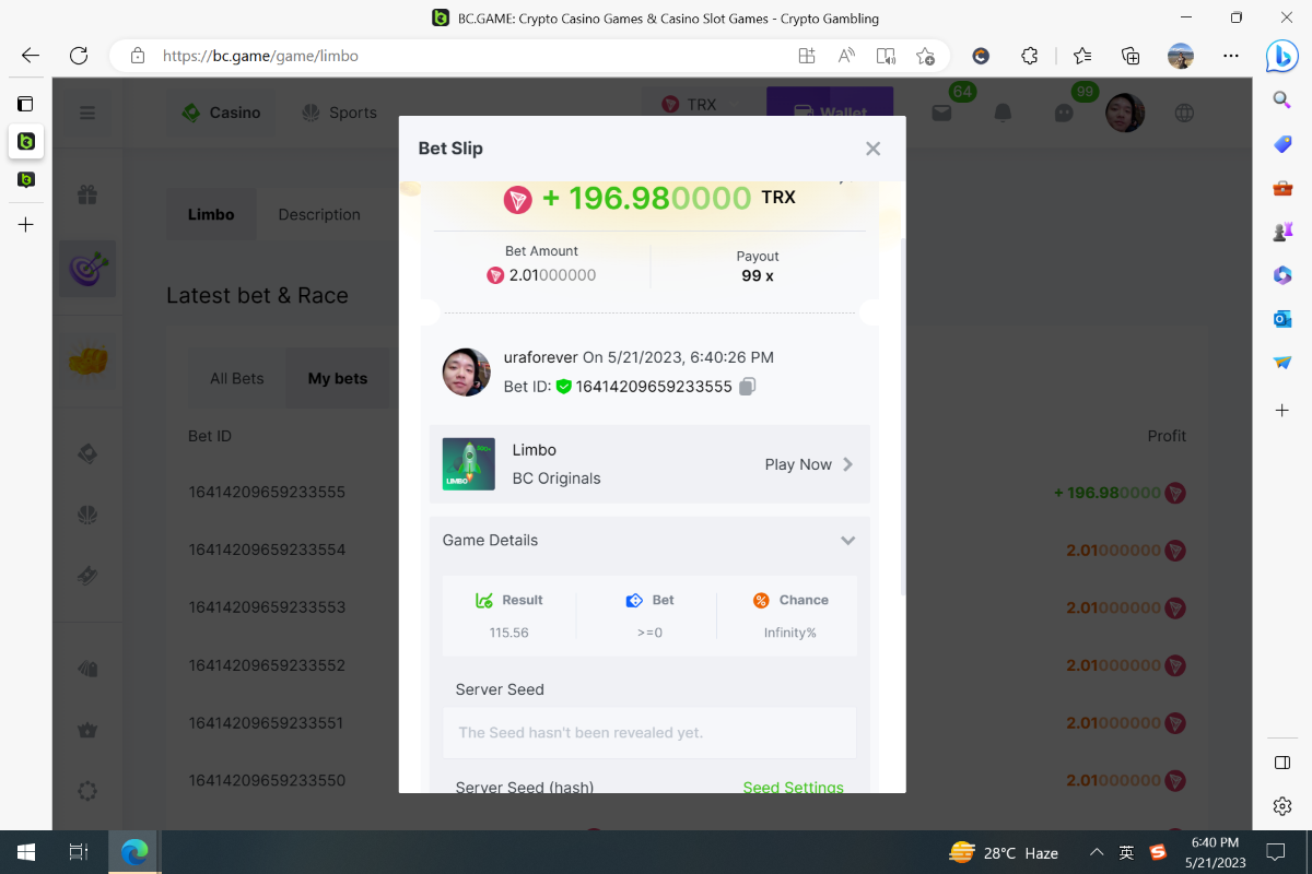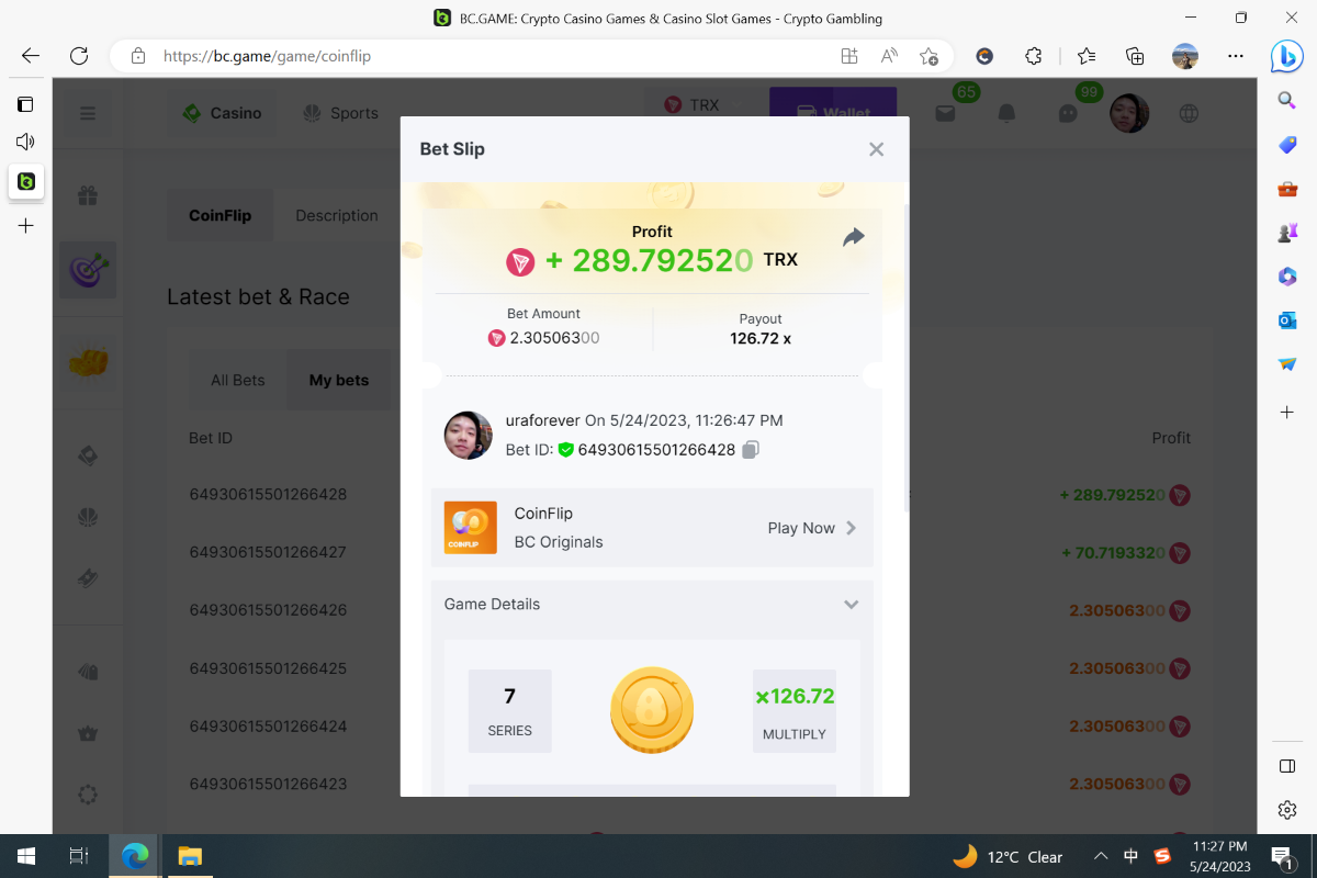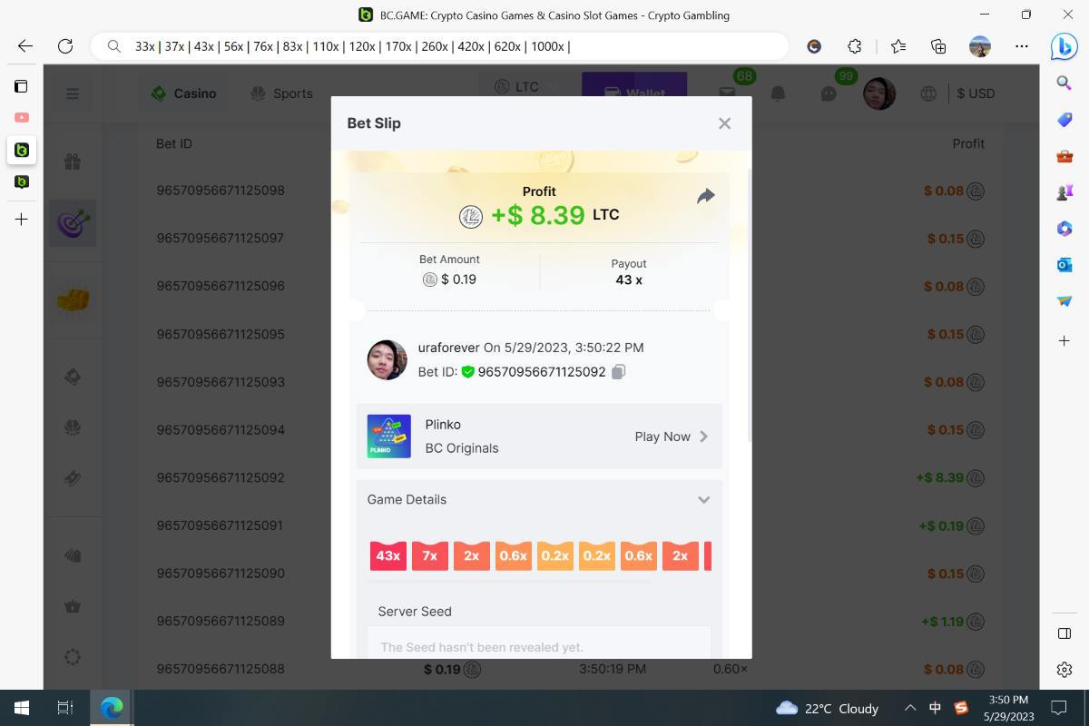 7. https://bc.game/#/sd/119B2BPPVVJBWZ Bet ID: 96385027536849814 The above is the bet as required. I did not realize you wont able to get link of the bet after 40 hands, thats why I did not have a chance to get the link for my highest winning 71.5X 's link, here is a screenshot of the game record and game ID if that works, If not, plz just use the link on top with the link pasted. Thanks. Cave Of Plunder-Win 96385027536849572