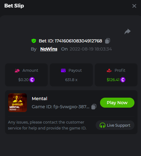 Mental: 631.8x https://bc.game/sd/?sd=10R6V7T3ZXR7DF Fire in the hole: 201.4x https://bc.game/sd/?sd=10RHS08USA9JWZ Tombstone R.I.P: 459.27x https://bc.game/sd/?sd=10RA41TLCRUYOJ San Quentin: 421.4x https://bc.game/sd/?sd=10R6N6LBS3LTZN Folsom Prison: 982.8x https://bc.game/sd/?sd=10RHGW9EOO1XCJ Karen Maneater: 391.3x https://bc.game/sd/?sd=10RHWNPP8HYUC3 Bounty (maybe) https://bc.game/sd/?sd=10R9KAEE20Z7RN -