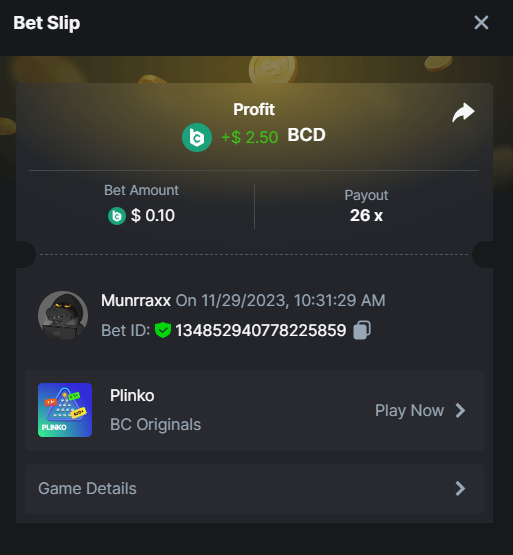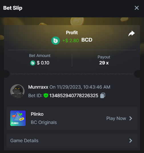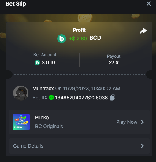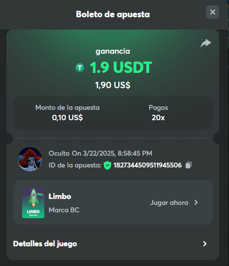 1. HARD 6. Limbo game is your target to win 200x or higher. https://bc.game/game-detail/1827307434501201443 1. Win on Wheel 48x or higher - Row 50, Segment High. https://bc.game/game-detail/1827312844856712226 Medium 1. Deposit At least $100 USD ID order: A-1827314325195331211 Txid: e697040c85293ef8ca2a8c32649fb68f7656cdb9244fd779d4c1b0616811a910 3. Get a payout of 73.6x on the original Plinko game Risk-High, Row-10. https://bc.game/game-detail/1827313990919787298 10. Buy at least 30 BC Lottery tickets using $BC Token. -or- Buy at least 2 BC Porsche lottery tickets using $BC Token send screenshot in forum post. 11. Win a sports parlay/combo bet with at least 3 matches and a 2.5x minimum payout to qualify. Ticket ID: 2515967632226787902 Easy 1. Deposit At least $50 USD ID order: A-1827314325195331211 Txid: e697040c85293ef8ca2a8c32649fb68f7656cdb9244fd779d4c1b0616811a910 2. Follow BC.GAME on Instagram, take a screenshot, and share it with your IG username in the forum! @yofreclavijo 4. Follow BC.GAME Twitter Take a screenshot of the following and include your Twitter username in the forum. @Mun11643102 5. Like and Retweet BC.GAME's latest post and tag at least 3 of your friends. Take a screenshot and include your Twitter username in the forum. @Mun11643102 6. Follow BC.GAME Facebook. Take a screenshot of the following and include your FB username in the forum. https://www.facebook.com/yofreclavijo/ 7. Win a payout of 20x on the original Limbo game. https://bc.game/game-detail/1827344509511945506 8. Win a Sports bet with a minimum payout of 1.5x odds (Only for single bets). Ticket ID: 2515280450730209380 9. Get a 20x multi in the Arabian Secret slot game. https://bc.game/game-detail/1827346561720961313 11. Activate 2FA security on your BC.Game account. Take a screenshot of 2FA and keep it active till the result is announced.