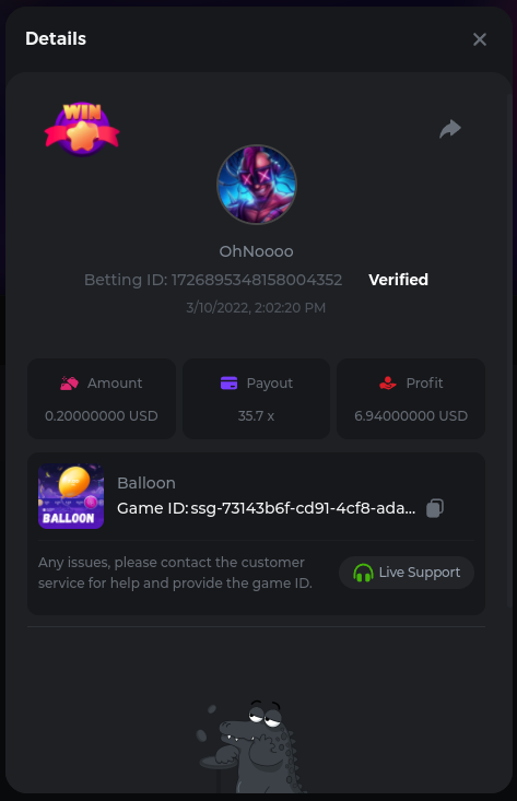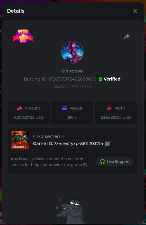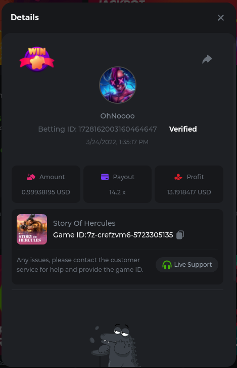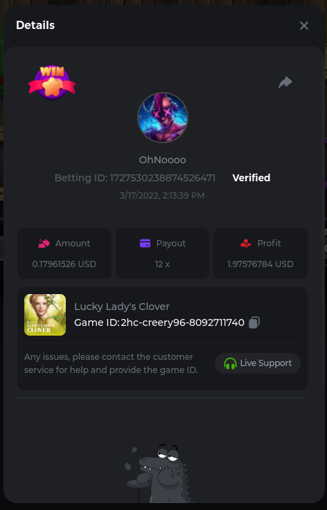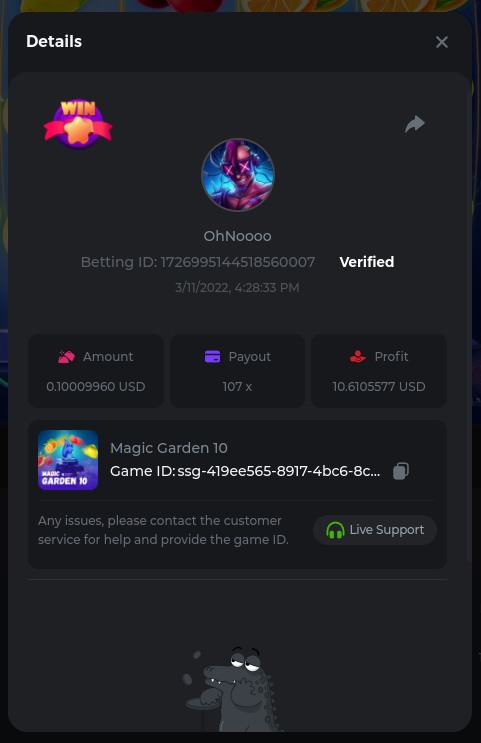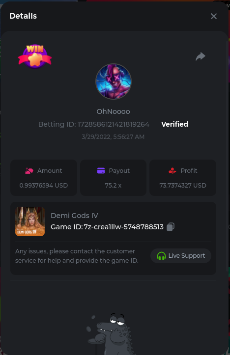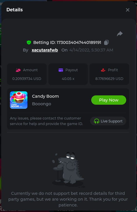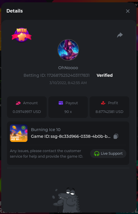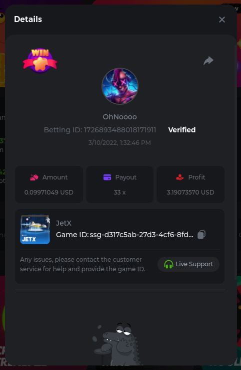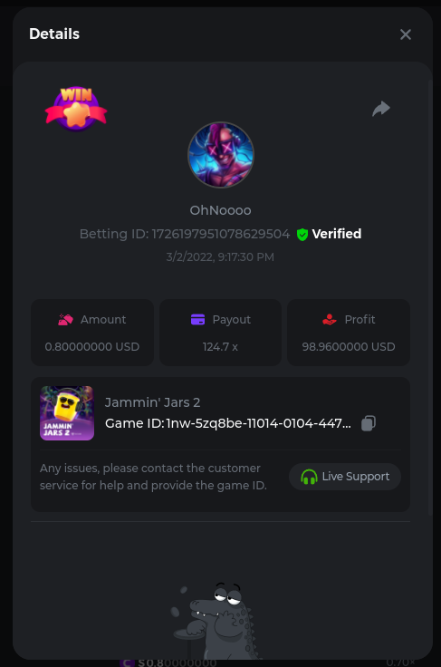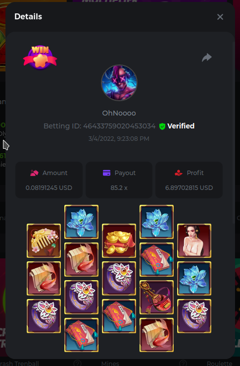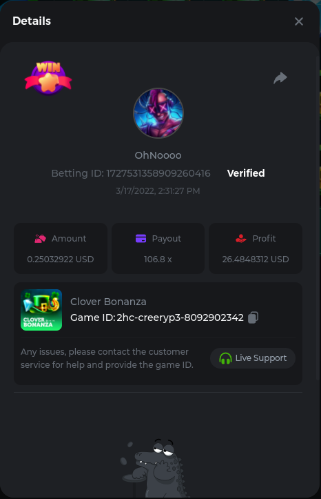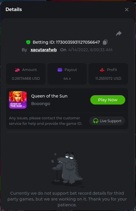 Golden Dancing Lion x 177.2 Betting ID: 1724947781266571904 Hit the Gold! x 44.8 Betting ID: 1724948222505448576 Tiger Jungle x 93 Betting ID: 1725143498319811079 Solar Queen x 47 Betting ID: 1725006049288958592