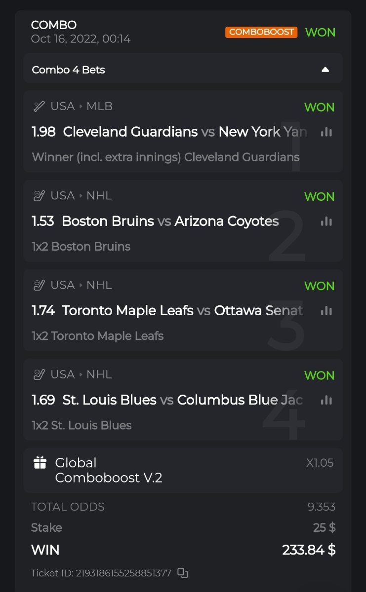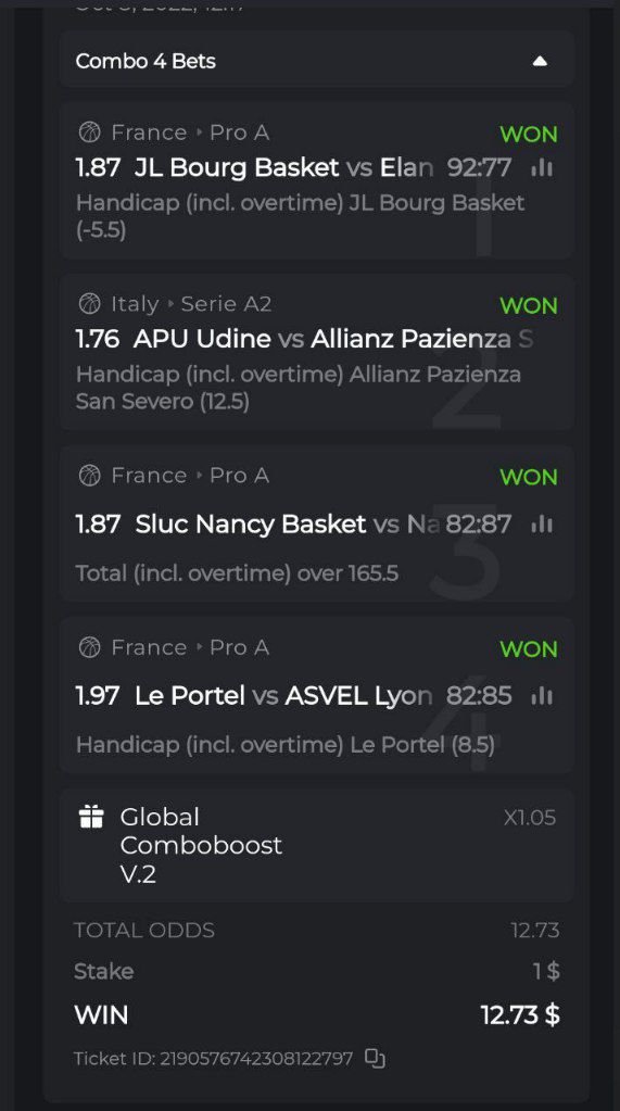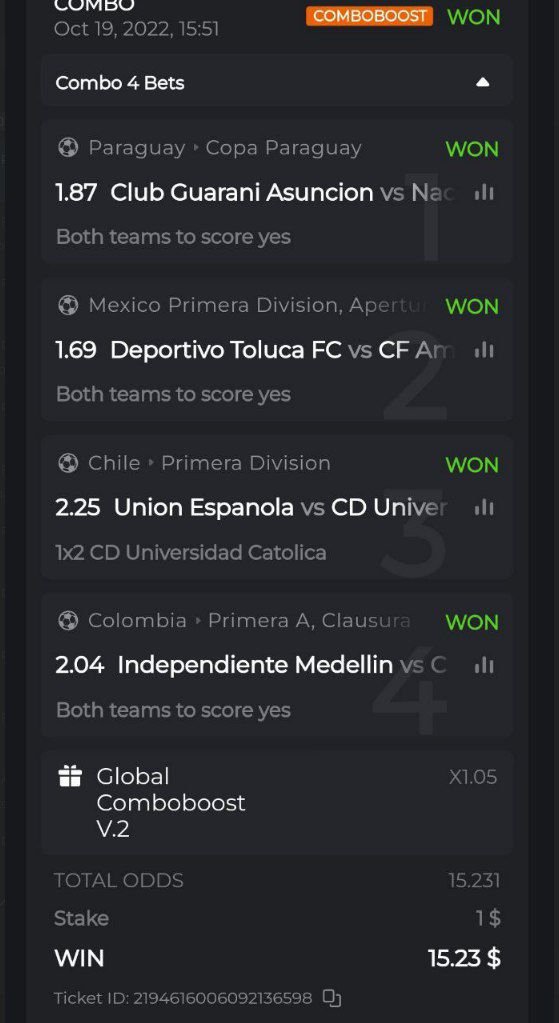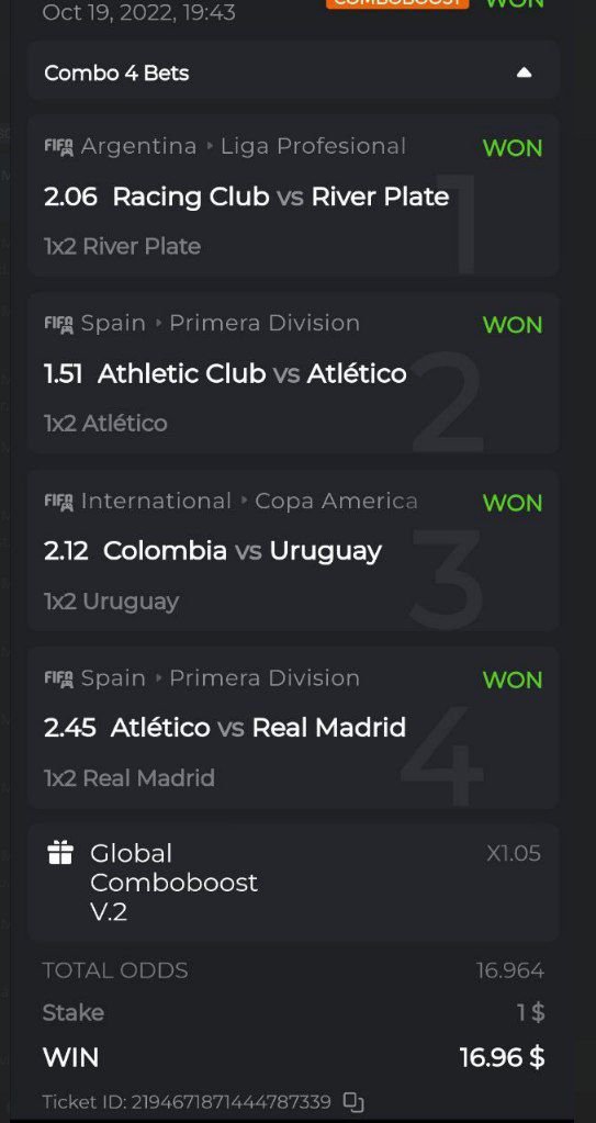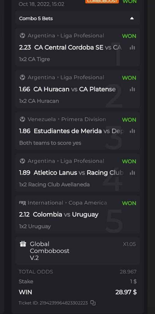 Zinzunzan Posted October 19, 2022 Share Posted October 19, 2022 The most recent parlay i won. I couldn't get the betslip link but here is the ticket ID and screenshot. Goodluck everyone !!! Ticket ID : 2193186155258851377 Link to comment Share on other sites More sharing options...