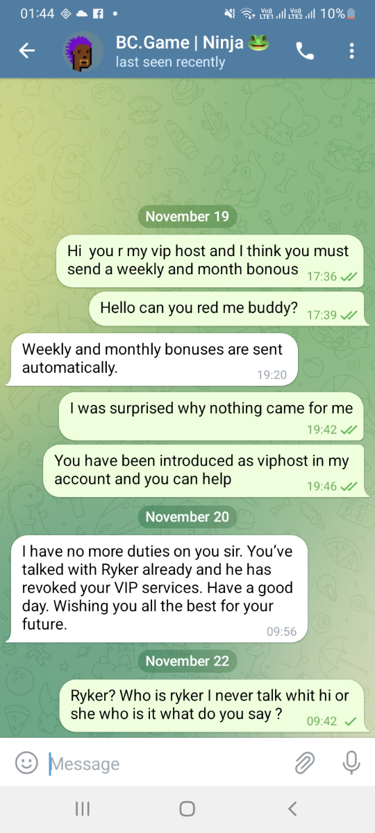 image.thumb.png.d0e0b1c0cf771cc9b8d96e32d5a06cd8.pngHow did your vip host by name name ryker manage to recognize that the person who chats with him on Telegram is the same account owner who locked the account due to misbehavior and cut off all vip, how did he recognize that anyone chats with him and curses and says. I am the owner of x's account, he destroys that account, where did you find these people and  give a manager to them, the Nobel Prize is not enough for you. My vip  host is bc game ninja  he talking about I talk by ryker who is ryker what is this funny cheap site