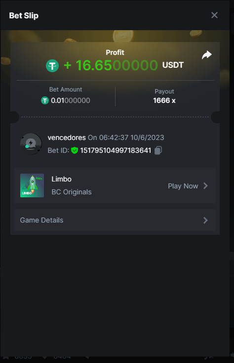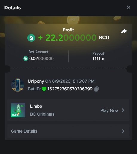 Maksypro Posted June 9, 2023 Share Posted June 9, 2023 Read Carefully Before Start To Hunt Daily Challenges #261 LIMBO Hunt : Win the highest multiplier Min Multiplier requirement 100x Min Level 4 ๏ธDuration Starting : Now End time : 23.59 UTC Time How to Join? Make screenshot + paste your bet link + UID or Profile link Any coin, with min bet 0.01 USD is allowed (jb/bb/bcl not allowed) Reward Prizes 1st Place.....$7 BCD 2nd Place.....$5 BCD 3rd Place.....$4 BCD 4th Place.....$3 BCD 5th Place.....$2 BCD ๐ต Winners will be announcing next day after Roll Point! 1 Link to comment Share on other sites More sharing options...
