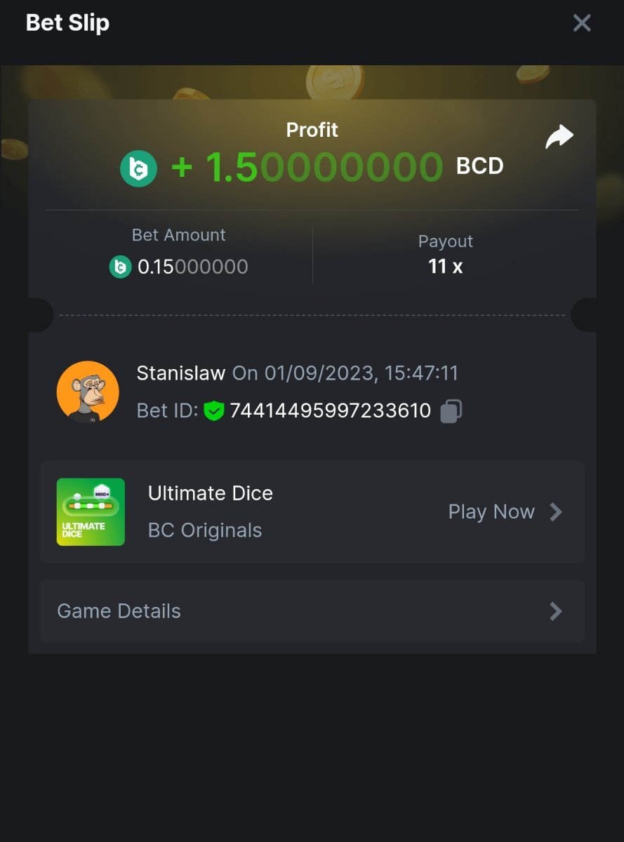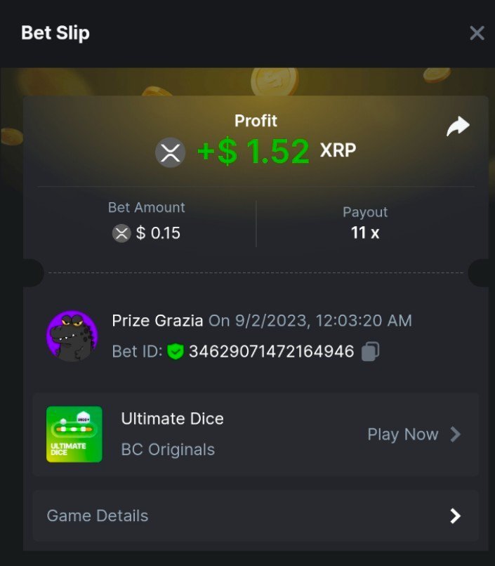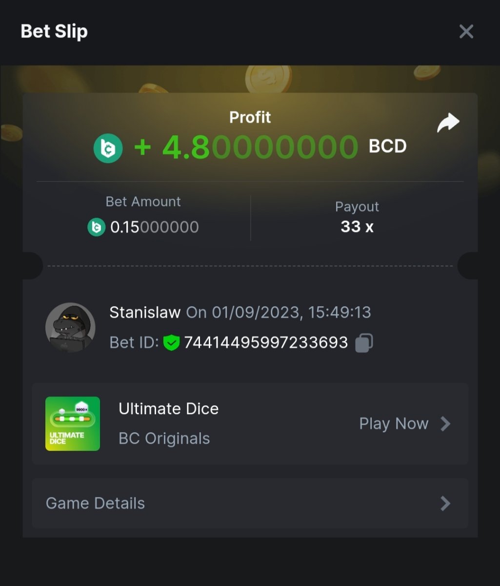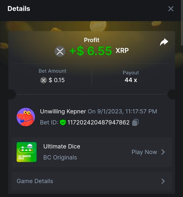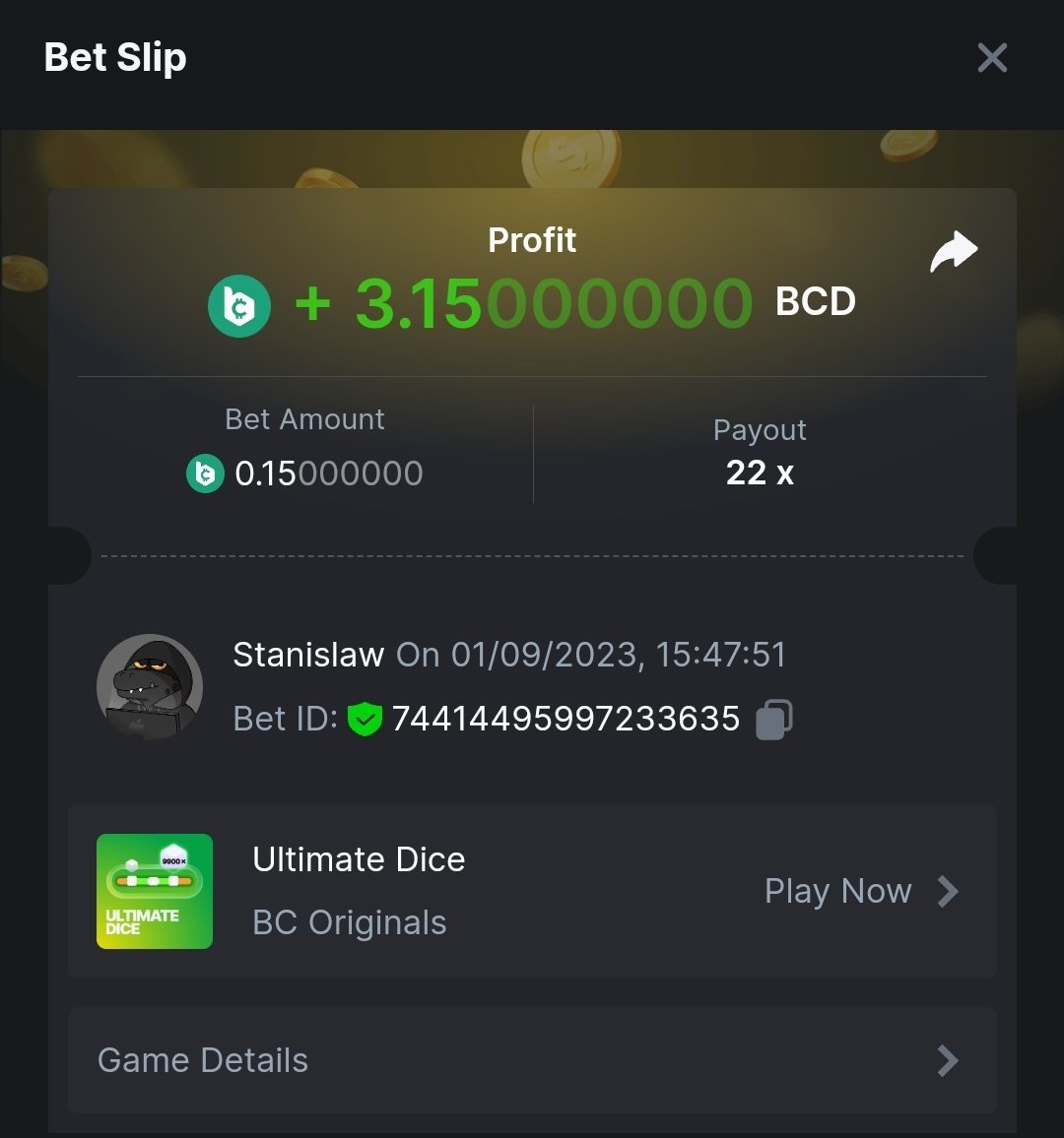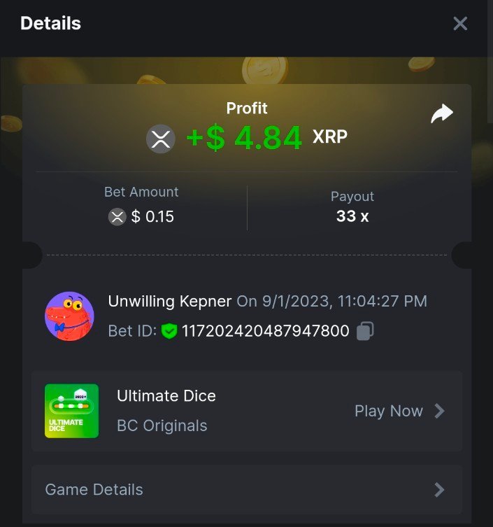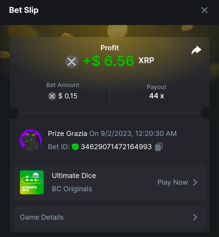 Admin BC_Jack Posted September 1, 2023 Admin Share Posted September 1, 2023 $5k Prestige Ultimate Dice Challenge #104 DURATION: 1st SEP - 8th SEP 13:20 pm UTC Greetings, BC.Game enthusiasts! The thrill of rolling the dice just got even more exhilarating! Dive into the "$5k Prestige Ultimate Dice Challenge #104", a spectacular arena where precision meets luck, and stand a chance to bask in glory and rewards. Running from 1st September to 8th September, this is your golden opportunity to showcase your prowess in Ultimate Dice and share a grand prize pool worth $5,000! Whether you're a seasoned player or just looking for a new challenge, this week promises unforgettable excitement and potentially handsome rewards. So, gear up, aim for those multipliers, and may fortune favor your rolls! Let's roll to victory! What's the Challenge? Complete as many of the following 20 multipliers on our in-house Ultimate Dice. Must be a winning bet. | 11x | 22x | 33x | 44x | 55x | 66x | 76.7441x | 87.6106x | 99x | 150x | 220x | 300x | 396x | 550x | 825x | 900x | 1100x | 2475x | 3300x | 4950x | Each multiplier you hit above counts as 1 point (Maximum 1 point for each multiplier). If there is a tie, the player with the higher average bet amount (in USD) shall be the winner. How to Enter To enter, copy the link of the bet you'd like to submit. Once you've copied it, paste it as a reply to this thread like so: Link: https://bc.game/#/sd/11H78LROL96057 In the same post, upload a screenshot of your win by clicking the game ID WITH VIEW IN USD mode ENABLED (accessible at the bottom of dropdown menu for your wallet up top. This way, we can ensure that your bet indeed met the minimum requirement at the time of placing it: Link: https://bc.game/#/sd/11H78LROL96057 Minimum VIP Minimum VIP 4 with phone verified will be eligible! Minimum Payouts Hit at least 4 payouts to qualify Minimum Bet Size $0.15 USD equivalent Eligible Coins All cryptocurrencies are eligible (excepting JB, and BCL) Available Prizes GENERAL TERMS Please combine all of your hits together in a SINGLE post. Edit your existing post for additional hits, don't create a new post. Bets must be posted within 24 hours of placing bet in order to keep things fair for everyone. Bets must be made during the specified time window stated above. This thread will lock automatically when the time period is over. One (1) entry per household. Anyone found attempting to win multiple prizes will be disqualified from this challenge as well as all future challenges. Failure to follow instructions will result in your submission being null and void. By entering this challenge, you acknowledge that BC.Game has the final decision on results and placement. Payouts will be distributed after the event is finished. Please note that it could take anywhere between 24 hours to 7 days after the completion of the event. 1 Link to comment Share on other sites More sharing options...