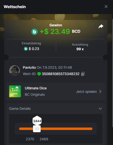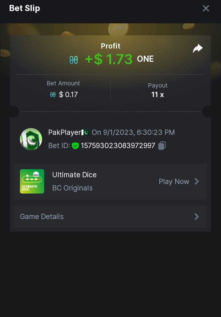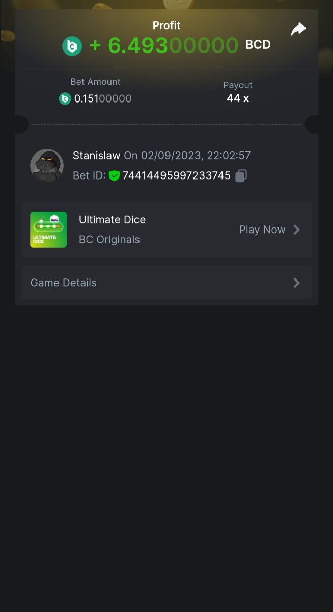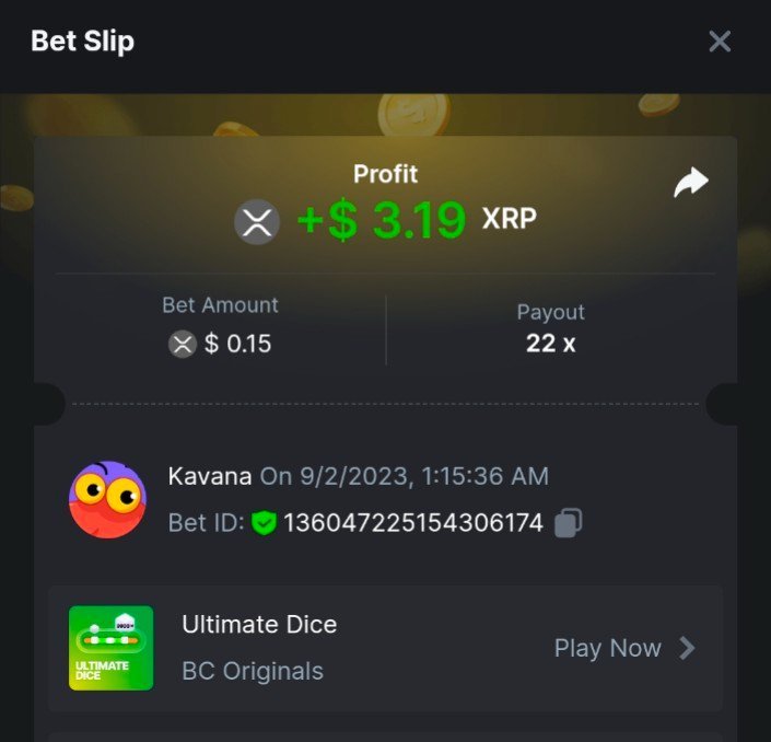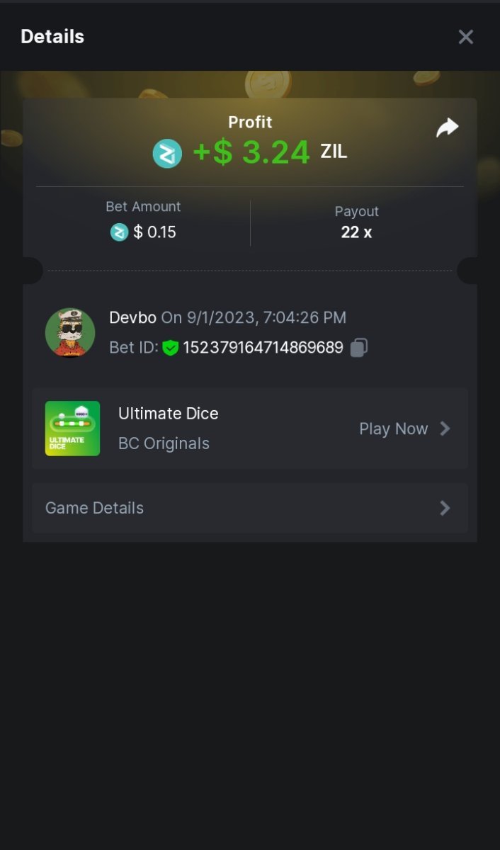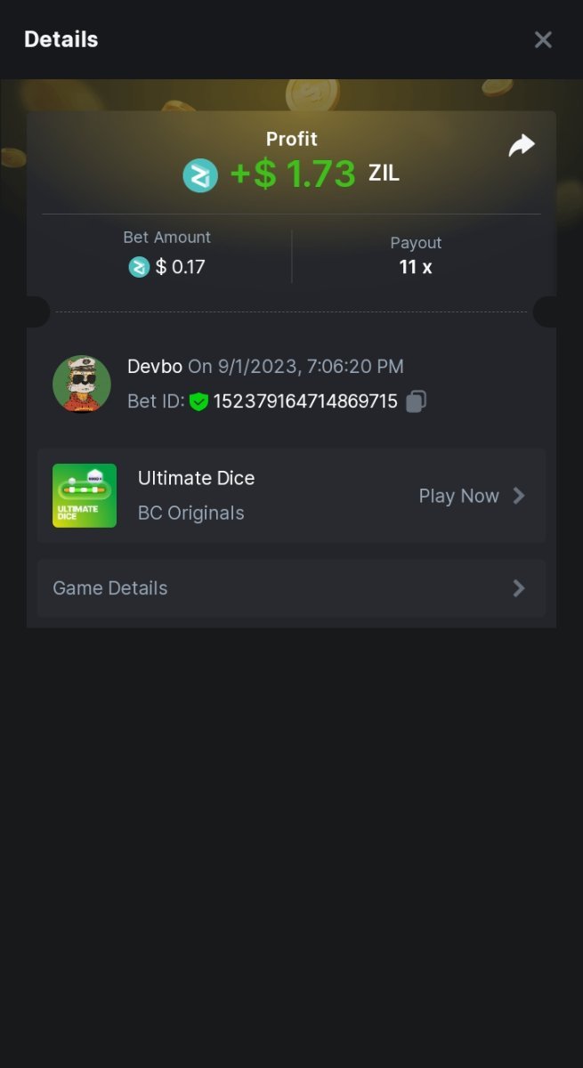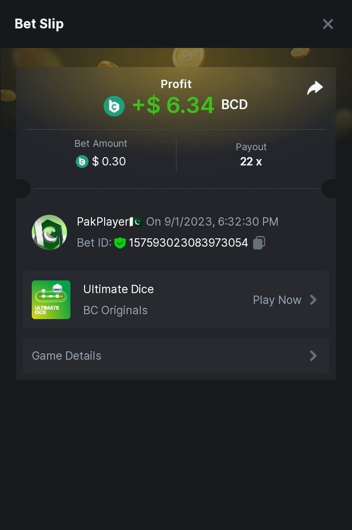 Admin BC_Jack Posted September 1, 2023 Admin Share Posted September 1, 2023 $5k Prestige Ultimate Dice Challenge #104 DURATION: 1st SEP - 8th SEP 13:20 pm UTC Greetings, BC.Game enthusiasts! The thrill of rolling the dice just got even more exhilarating! Dive into the "$5k Prestige Ultimate Dice Challenge #104", a spectacular arena where precision meets luck, and stand a chance to bask in glory and rewards. Running from 1st September to 8th September, this is your golden opportunity to showcase your prowess in Ultimate Dice and share a grand prize pool worth $5,000! Whether you're a seasoned player or just looking for a new challenge, this week promises unforgettable excitement and potentially handsome rewards. So, gear up, aim for those multipliers, and may fortune favor your rolls! Let's roll to victory! What's the Challenge? Complete as many of the following 20 multipliers on our in-house Ultimate Dice. Must be a winning bet. | 11x | 22x | 33x | 44x | 55x | 66x | 76.7441x | 87.6106x | 99x | 150x | 220x | 300x | 396x | 550x | 825x | 900x | 1100x | 2475x | 3300x | 4950x | Each multiplier you hit above counts as 1 point (Maximum 1 point for each multiplier). If there is a tie, the player with the higher average bet amount (in USD) shall be the winner. How to Enter To enter, copy the link of the bet you'd like to submit. Once you've copied it, paste it as a reply to this thread like so: Link: https://bc.game/#/sd/11H78LROL96057 In the same post, upload a screenshot of your win by clicking the game ID WITH VIEW IN USD mode ENABLED (accessible at the bottom of dropdown menu for your wallet up top. This way, we can ensure that your bet indeed met the minimum requirement at the time of placing it: Link: https://bc.game/#/sd/11H78LROL96057 Minimum VIP Minimum VIP 4 with phone verified will be eligible! Minimum Payouts Hit at least 4 payouts to qualify Minimum Bet Size $0.15 USD equivalent Eligible Coins All cryptocurrencies are eligible (excepting JB, and BCL) Available Prizes GENERAL TERMS Please combine all of your hits together in a SINGLE post. Edit your existing post for additional hits, don't create a new post. Bets must be posted within 24 hours of placing bet in order to keep things fair for everyone. Bets must be made during the specified time window stated above. This thread will lock automatically when the time period is over. One (1) entry per household. Anyone found attempting to win multiple prizes will be disqualified from this challenge as well as all future challenges. Failure to follow instructions will result in your submission being null and void. By entering this challenge, you acknowledge that BC.Game has the final decision on results and placement. Payouts will be distributed after the event is finished. Please note that it could take anywhere between 24 hours to 7 days after the completion of the event. 1 Link to comment Share on other sites More sharing options...