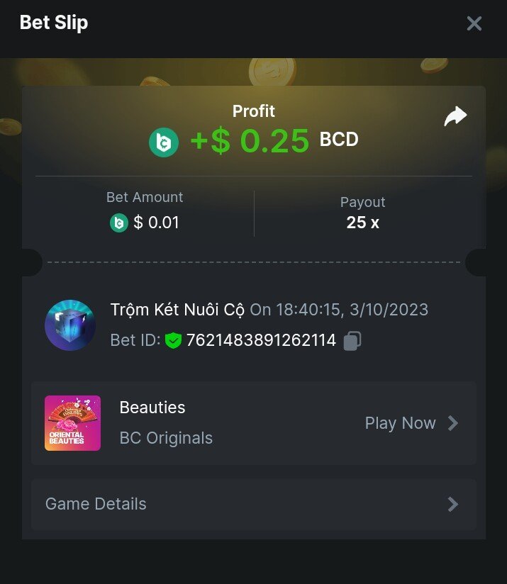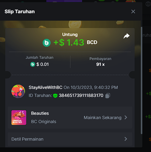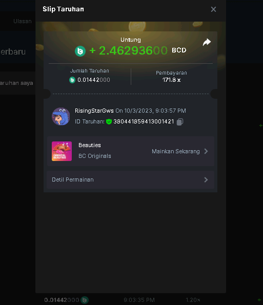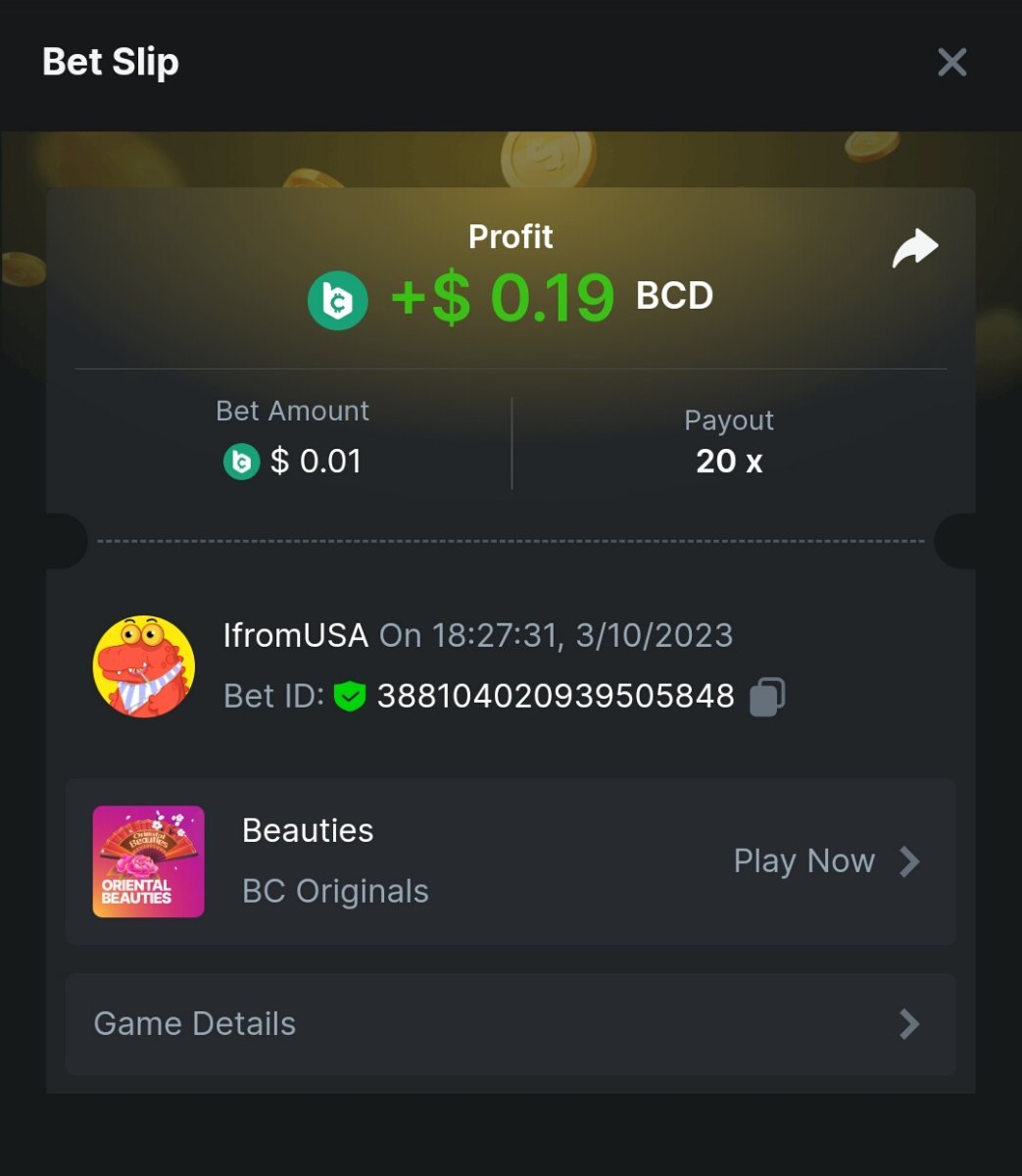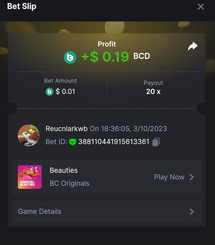 Moderator Giandreas Posted October 3, 2023 Moderator Share Posted October 3, 2023 Read Carefully Before Start To Hunt Forum Daily Challenges #376Hunt : Oriental Beauties Win the highest pay out Min Payout : x20 Min Level 4️Duration Starting : Now End time : 23.59 UTC Time How to Join? Make screenshot + paste your bet link + UID or Profile link Any coin, with min bet 0.01 USD is allowed (jb/bb/bcl not allowed)Reward Prizes 1st Place.....$7 BCD 2nd Place.....$5 BCD 3rd Place.....$4 BCD 4th Place.....$3 BCD 5th Place.....$2 BCD 🏵 Winners will be announcing next day after Roll Point! 2 Link to comment Share on other sites More sharing options...