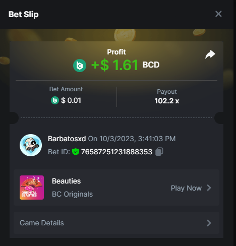 Moderator Giandreas Posted October 4, 2023 Author Moderator Share Posted October 4, 2023 List of winner daily Forum challenges #376 1st place . . . . 7$ BCD - RisingStarGws - 171.8x 2.462 2nd place . . . . 5$ BCD - Kristalina - 108.2x 1.23 3rd place . . . . 4$ BCD - Barbatosxd - 102x 1.61 4th place . . . . 3$ BCD - Oppo0107 - 99.2x 1.66 5th place . . . . 2$ BCD - Mired - 92.4x 1.34Please,don't forget UID for your post How to claim your reward for: Double Flashdrop | Daily Challenges??? These steps help us faster to verify. Step by step how to claim : DM/PM Me (forum) and Telegram @Kikikom31 And wait for accepting.( If you accepted and didn't answer for 5 min you will be removed and have to join again) Share the screenshot Share the win bet link (daily challenges) Share UID or Profile linkWait for a response Link to comment Share on other sites More sharing options...