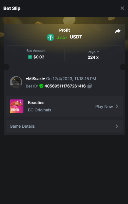 4th place . . . .  3$ BCD  - baccarar - 111.6x  1.36