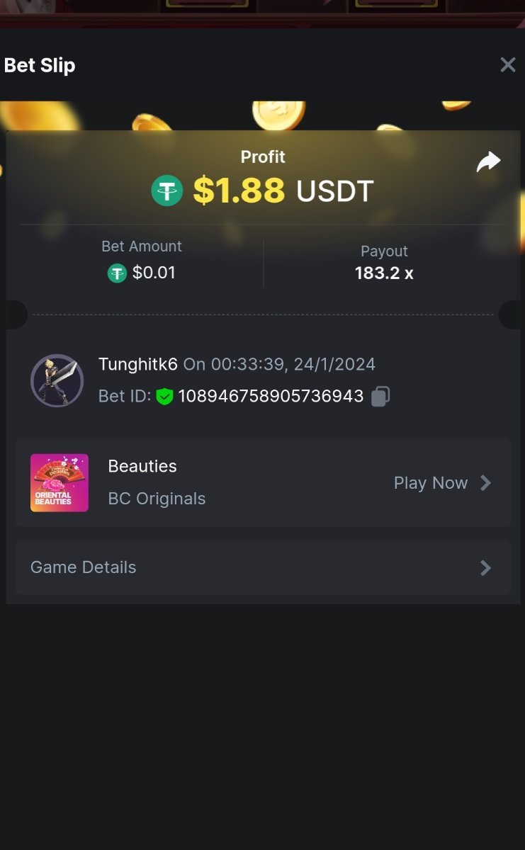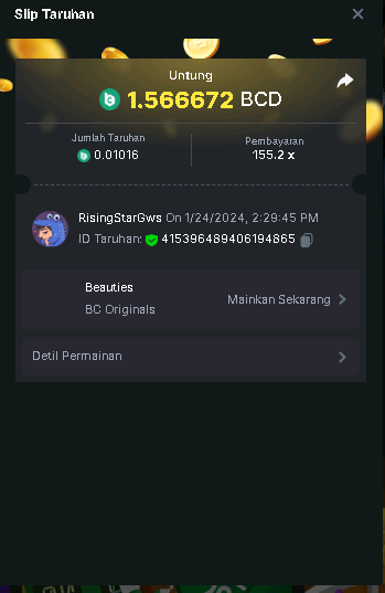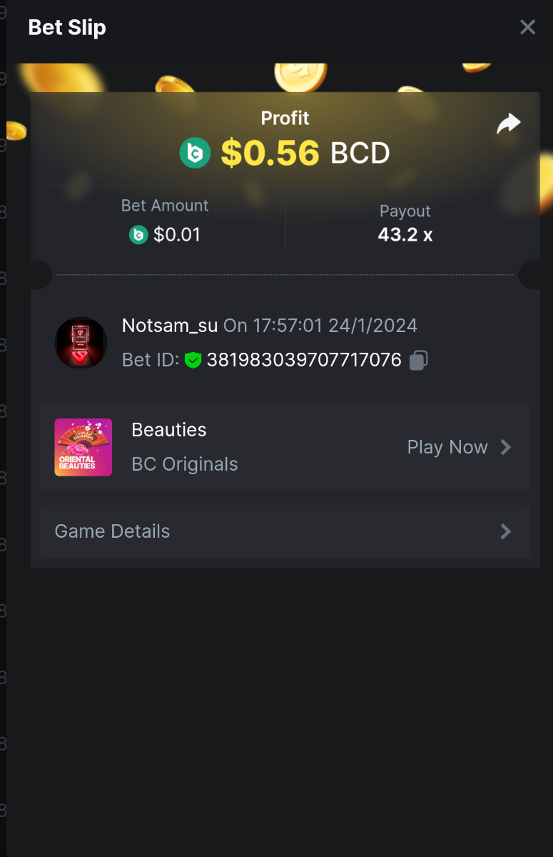 Moderator Giandreas Posted January 24, 2024 Moderator Share Posted January 24, 2024 Read Carefully Before Start To Hunt Forum Daily Challenges #489Hunt :ย Oriental Beauties Win the highest pay out Min Payoutย :ย x20 Min Level 10๏ธDuration Starting : Now End time : 23.59 UTC Time How to Join? Make screenshot + paste your bet link + UID or Profile link Any coin, with min bet 0.01 USD is allowed (jb/bb/bcl not allowed)Reward Prizes 1st Place.....$7 BCD 2nd Place.....$5 BCD 3rd Place.....$4 BCD 4th Place.....$3 BCD 5th Place.....$2 BCD ๐ต Winners will be announcing next day after Roll Point! Link to comment Share on other sites More sharing options...