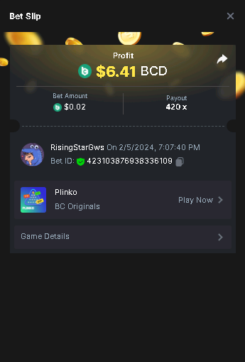 Moderator Giandreas Posted February 5, 2024 Moderator Share Posted February 5, 2024 Read Carefully Before Start To Hunt Forum Daily Challenges #501Hunt : Plinko Win the highest pay out Min Payout : x120 Min Level 10️Duration Starting : Now End time : 23.59 UTC Time How to Join? Make screenshot + paste your bet link + UID or Profile link Any coin, with min bet 0.01 USD is allowed (jb/bb/bcl not allowed)Reward Prizes 1st Place.....$7 BCD 2nd Place.....$5 BCD 3rd Place.....$4 BCD 4th Place.....$3 BCD 5th Place.....$2 BCD 🏵 Winners will be announcing next day after Roll Point! 1 Link to comment Share on other sites More sharing options...