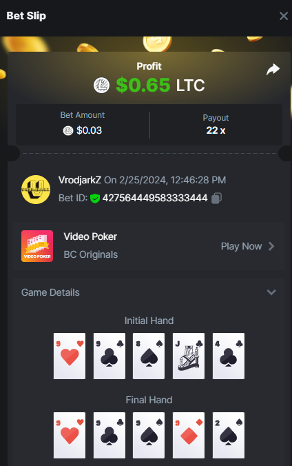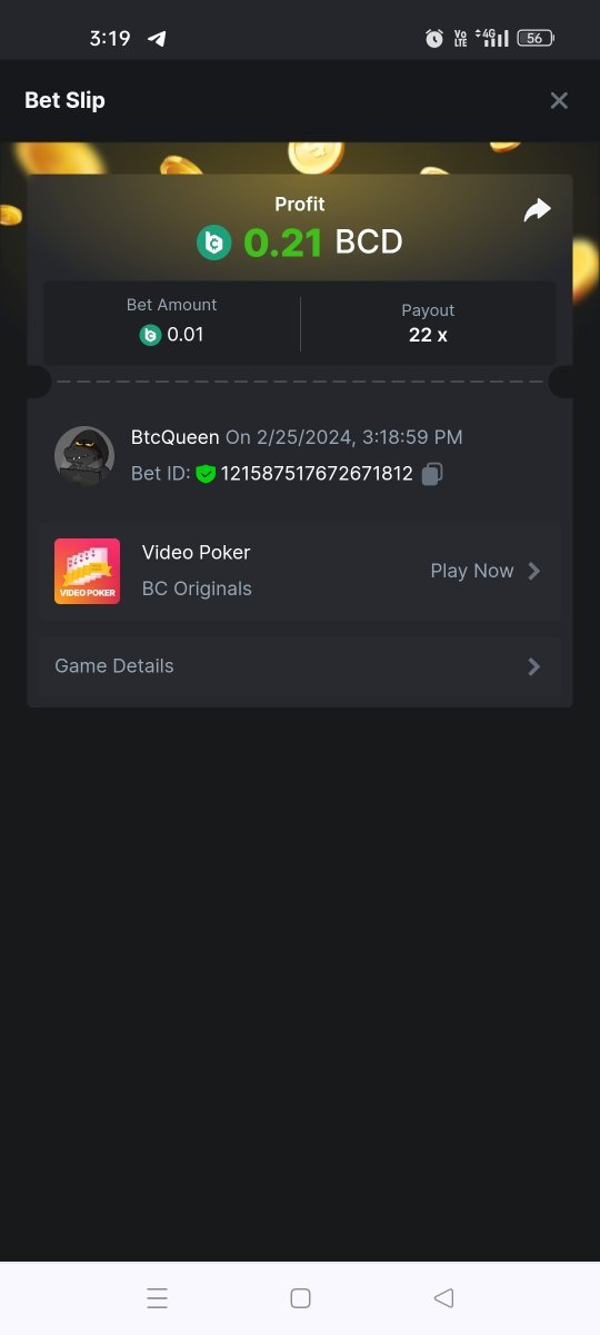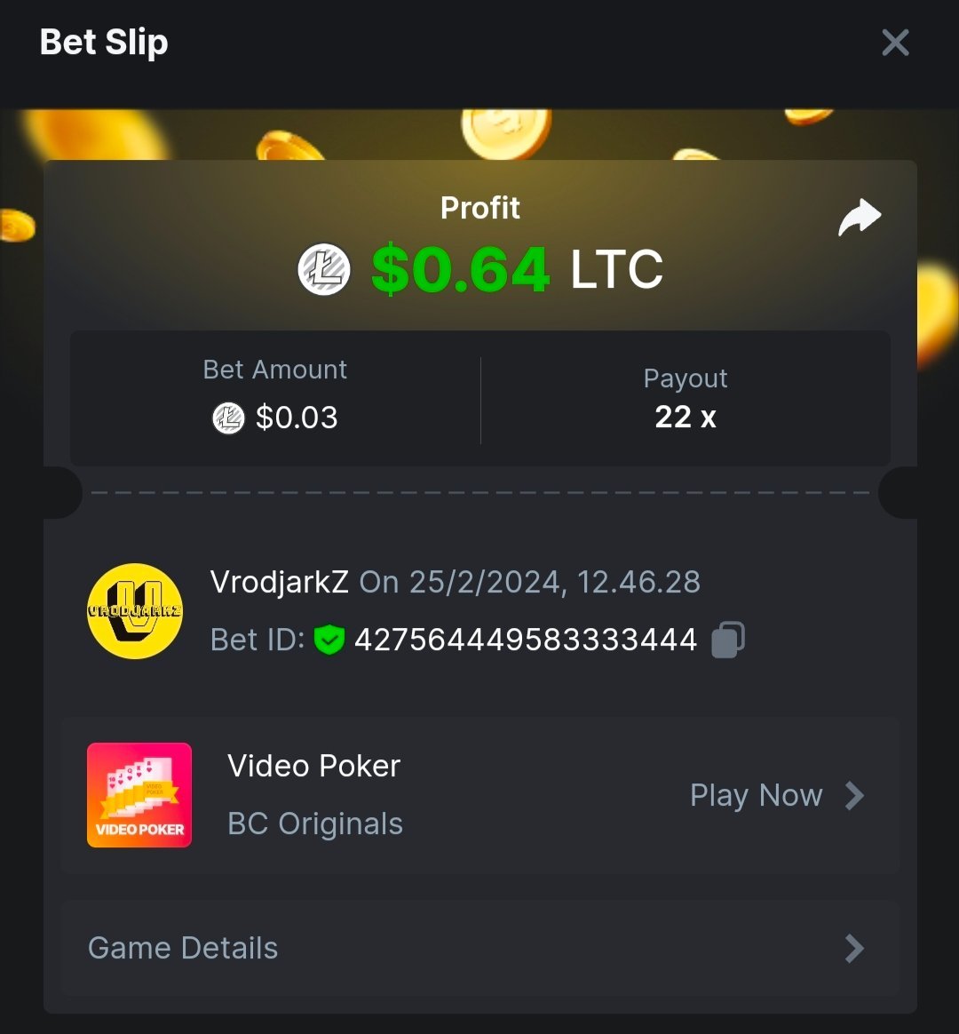 Moderator Giandreas Posted February 25, 2024 Moderator Share Posted February 25, 2024 Read Carefully Before Start To Hunt Forum Daily Challenges #521Hunt : Video Poker Win the highest pay out Min Payout : 6x Min Level 10 ️Duration Starting : Now End time : 23.59 UTC Time How to Join? Make screenshot + paste your bet link + UID or Profile link Any coin, with min bet 0.01 USD is allowed (jb/bb/bcl not allowed) Reward Prizes 1st Place.....$7 BCD 2nd Place.....$5 BCD 3rd Place.....$4 BCD 4th Place.....$3 BCD 5th Place.....$2 BCD 🏵 Winners will be announcing next day after Roll Point! Link to comment Share on other sites More sharing options...