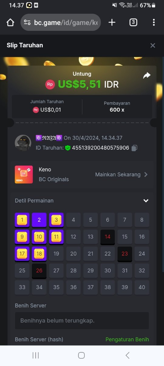 Moderator Giandreas Posted April 30, 2024 Moderator Share Posted April 30, 2024 Read Carefully Before Start To Hunt Forum Daily Challenges #586Hunt : Keno Win the highest pay out Min Payout : x90 Min Level 10️Duration Starting : Now End time : 23.59 UTC Time How to Join? Make screenshot + paste your bet link + UID or Profile link Any coin, with min bet 0.01 USD is allowed (jb/bb/bcl not allowed)Reward Prizes 1st Place.....$7 BCD 2nd Place.....$5 BCD 3rd Place.....$4 BCD 4th Place.....$3 BCD 5th Place.....$2 BCD 🏵 Winners will be announcing next day after Roll Point! 1 Link to comment Share on other sites More sharing options...