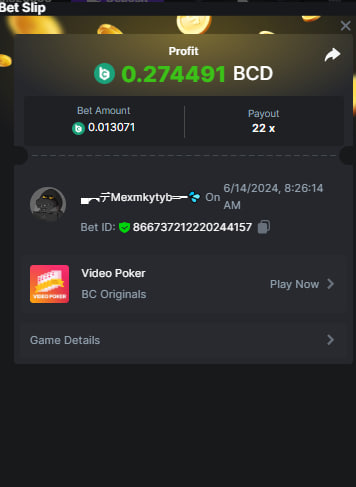 Moderator Giandreas Posted June 14, 2024 Moderator Share Posted June 14, 2024 Read Carefully Before Start To Hunt Forum Daily Challenges #631Hunt : VIdeo poker Win the highest pay out Min Payout : 9x Min Level 10️Duration Starting : Now End time : 23.59 UTC Time How to Join? Make screenshot + paste your bet link + UID or Profile link Any coin, with min bet 0.01 USD is allowed (jb/bb/bcl not allowed)Reward Prizes 1st Place.....$7 BCD 2nd Place.....$5 BCD 3rd Place.....$4 BCD 4th Place.....$3 BCD 5th Place.....$2 BCD 🏵 Winners will be announcing next day after Roll Point! 1 Link to comment Share on other sites More sharing options...