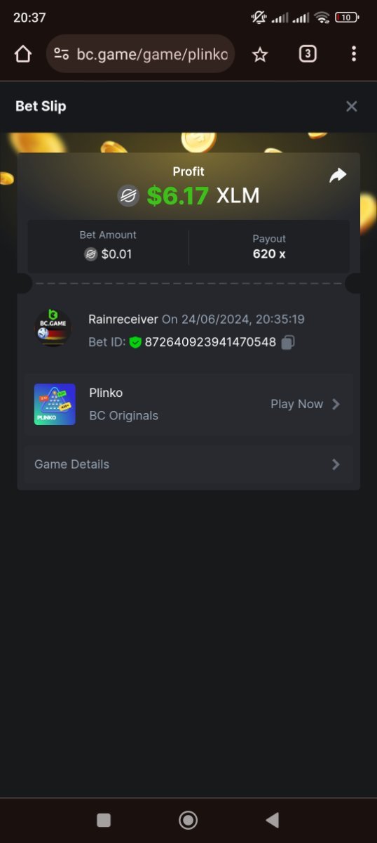 Moderator Giandreas Posted June 24, 2024 Moderator Share Posted June 24, 2024 Read Carefully Before Start To Hunt Forum Daily Challenges #641Hunt : Plinko Win the highest pay out Min Payout : 120x Min Level 10️Duration Starting : Now End time : 23.59 UTC Time How to Join? Make screenshot + paste your bet link + UID or Profile link Any coin, with min bet 0.01 USD is allowed (jb/bb/bcl not allowed)Reward Prizes 1st Place.....$7 BCD 2nd Place.....$5 BCD 3rd Place.....$4 BCD 4th Place.....$3 BCD 5th Place.....$2 BCD 🏵 Winners will be announcing next day after Roll Point! Link to comment Share on other sites More sharing options...