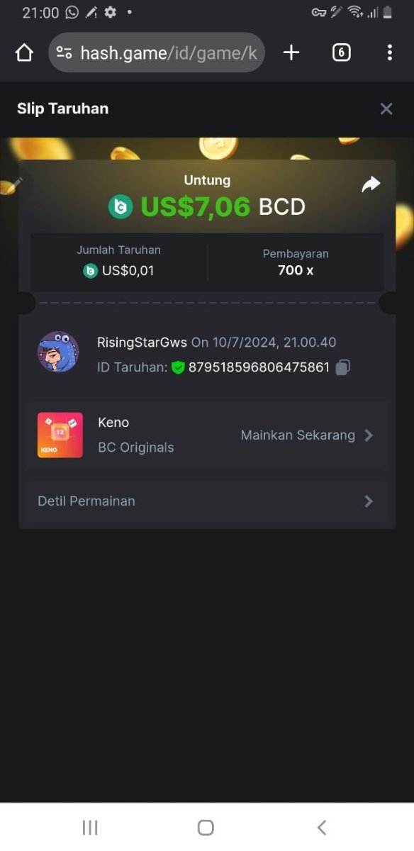 Moderator Giandreas Posted July 10, 2024 Moderator Share Posted July 10, 2024 Read Carefully Before Start To Hunt Forum Daily Challenges #657Hunt : Keno Win the highest pay out Min Payout : x90 Min Level 10️Duration Starting : Now End time : 23.59 UTC Time How to Join? Make screenshot + paste your bet link + UID or Profile link Any coin, with min bet 0.01 USD is allowed (jb/bb/bcl not allowed)Reward Prizes 1st Place.....$7 BCD 2nd Place.....$5 BCD 3rd Place.....$4 BCD 4th Place.....$3 BCD 5th Place.....$2 BCD 🏵 Winners will be announcing next day after Roll Point! Link to comment Share on other sites More sharing options...