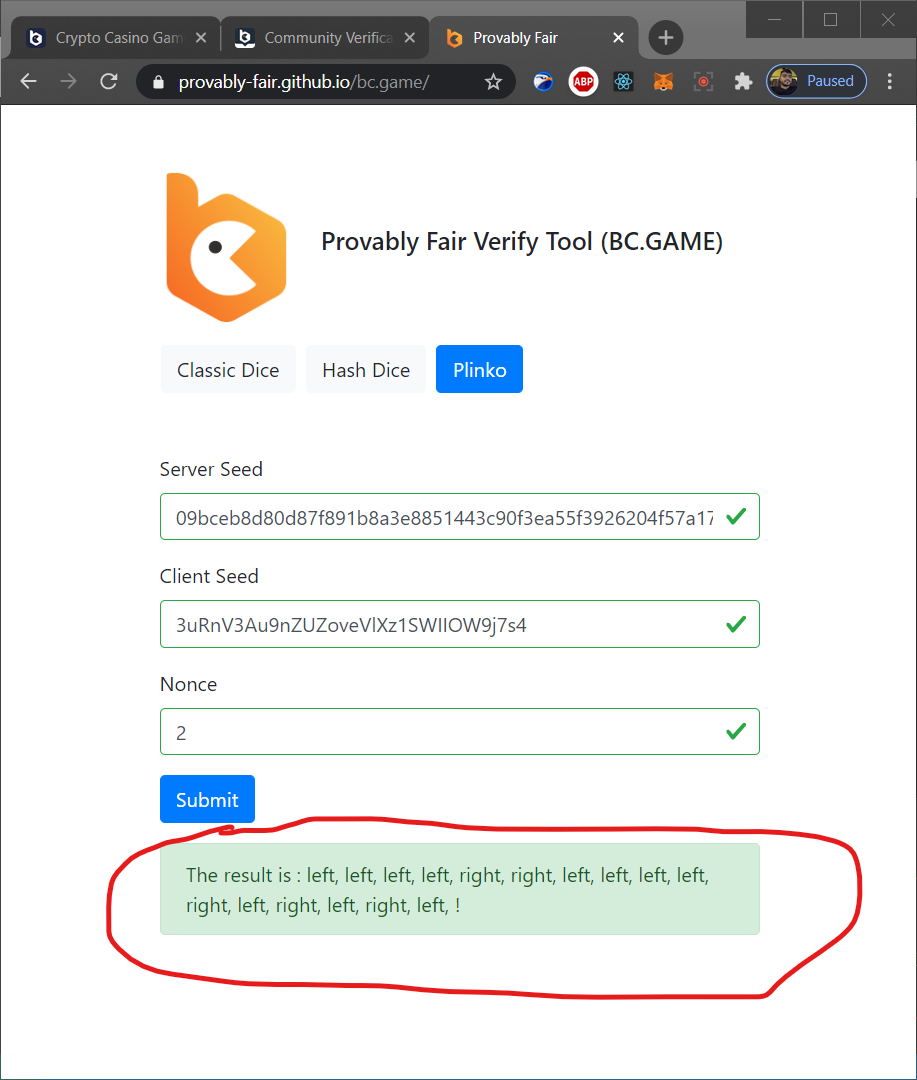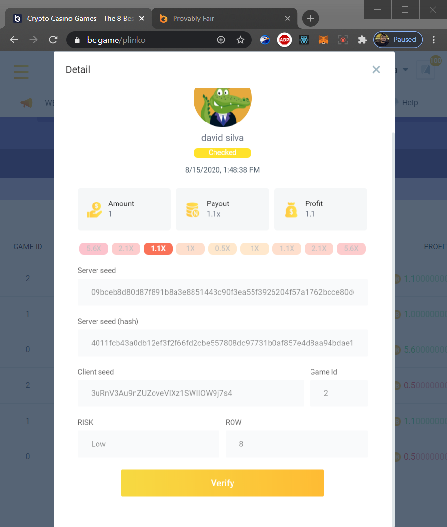 Admin Coco_o Posted August 21, 2020 Admin Share Posted August 21, 2020 On 8/15/2020 at 12:45 PM, davidsilvarao443 said: Plinko is also verified using provably fair verification tool. Kindly review. https://provably-fair.github.io/bc.game/ @Coco_Father where is the final result Link to comment Share on other sites More sharing options...