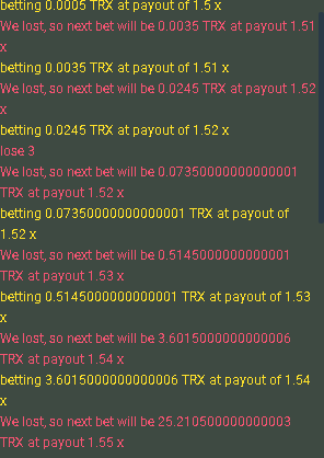 Rotan555 Posted July 12, 2021 Share Posted July 12, 2021 var config = { baseBet: { label: 'base bet', value: currency.minAmount * 1.2, type: 'number' }, basePayout: { label: 'base payout', value: 2, type: 'number' }, stop: { label: 'stop if bet >', value: 1e8, type: 'number' }, onLoseTitle: { label: 'On Lose', type: 'title' }, onLoss: { label: '', value: 'increase', type: 'radio', options: [ { value: 'reset', label: 'Return to base bet' }, { value: 'increase', label: 'Increase bet by (loss multiplier)' }, { value: 'increase', label: 'Increase payout by (loss payout)' } ] }, lossMultiplier: { label: 'loss multiplier', value: 2, type: 'number' }, lossAdd: { label: 'loss payout +/-', value: 1, type: 'number' }, onWinTitle: { label: 'On Win', type: 'title' }, onWin: { label: '', value: 'reset', type: 'radio', options: [ { value: 'reset', label: 'Return to base bet' }, { value: 'increase', label: 'Increase bet and payout' }, { value: 'increase', label: 'Increase payout by (win payout)' } ] }, winMultiplier: { label: 'win multiplier', value: 2, type: 'number' }, winAdd: { label: 'win payout +/-', value: 1, type: 'number' }, } function main () { var currentBet = config.baseBet.value; var currentPayout = config.basePayout.value; engine.on('GAME_STARTING', function () { engine.bet(currentBet, currentPayout); }) engine.on('GAME_ENDED', function () { var history = engine.getHistory() var lastGame = history[0] // If we wagered, it means we played if (!lastGame.wager) { return; } var lose1 = config.lossMultiplier.value; var lose2 = config.winMultiplier.value; var con1 = currentBet/lose2/2/lose1/lose1; var con2 = currentBet/3/lose1/lose1/lose2/2; var con3 = currentBet/3/3/lose1/lose1/lose2/2; var con4 = currentBet/3/3/3/lose1/lose1/lose2/2; var con5 = currentBet/3/3/3/3/lose1/lose1/lose2/2; var con6 = currentBet/3/3/3/3/3/lose1/lose1/lose2/2; var con7 = currentBet/3/3/3/3/3/3/lose1/lose1/lose2/2; var cons1 = currentBet/lose2; // we won.. if (lastGame.cashedAt) { if (config.onWin.value === 'reset') { currentBet = config.baseBet.value; currentPayout = config.basePayout.value; } else { if(cons1 == config.baseBet.value){ currentBet = config.baseBet.value; currentBet *= config.winMultiplier.value * 2; log.success('WON'); }else{ currentBet = config.baseBet.value; currentPayout = config.basePayout.value; currentBet *= config.winMultiplier.value; currentPayout += config.winAdd.value; } } log.success('We won, so next bet will be ' + currentBet + ' ' + currency.currencyName + ' at payout ' + currentPayout + ' x'); }else{ if (config.onLoss.value === 'reset') { currentBet = config.baseBet.value; currentPayout = config.basePayout.value; } else { if(con1 == config.baseBet.value){ currentBet *= 3; log.error('lose 3'); }else if(con2 == config.baseBet.value){ currentBet *= 3; log.error('lose 4'); }else if (con3 == config.baseBet.value){ currentBet *= 3; log.error('lose 5'); }else if (con4 == config.baseBet.value){ currentBet *= 3; log.error('lose 6'); }else if (con5 == config.baseBet.value){ currentBet *= 3; log.error('lose 7'); }else if (con6 == config.baseBet.value){ currentBet *= 3; log.error('lose 8'); }else if (con7 == config.baseBet.value){ currentBet *= 3; log.error('lose 8'); }else{ currentBet *= config.lossMultiplier.value; currentPayout += config.lossAdd.value; } } log.error('We lost, so next bet will be ' + currentBet + ' ' + currency.currencyName + ' at payout ' + currentPayout + ' x'); } if (currentBet > config.stop.value) { log.error('Was about to bet' + currentBet + 'which triggers the stop'); engine.stop(); } }) } Link to comment Share on other sites More sharing options...
