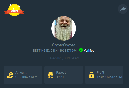 I won on Savior Sword 49.2x - the Sword and the Wheel Spin, but I was only betting 0.1 XLM so the payout was only 5.05 XLM. But the cool part is that I used the trick that the dude in the forum posted. I started at 0.1 XLM for a warm up, then I slowly increased to 1.8 XLM and returned to 0.1 XLM and it triggered a 10x and two spins after, this win, so I am kind of shocked because I've tried many times to get a wheel spin and I've only ever gotten it a couple of times in hundreds of spins, then as soon as I try this trick it works! I changed my name yesterday from Worried Elwon to CryptoCoyote, that's why you see two different names.