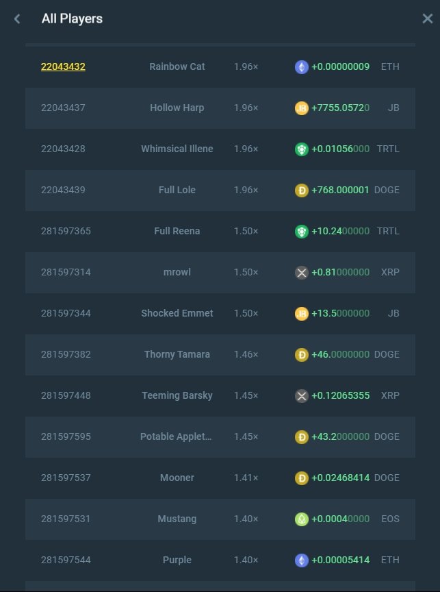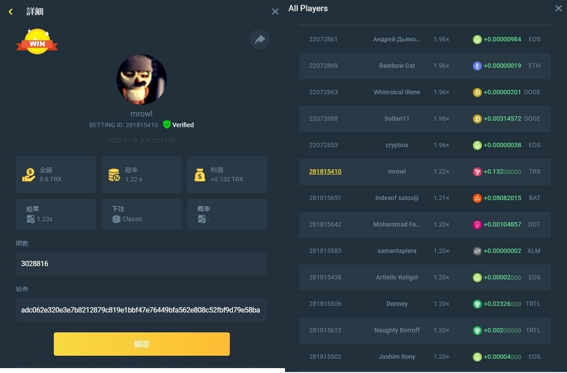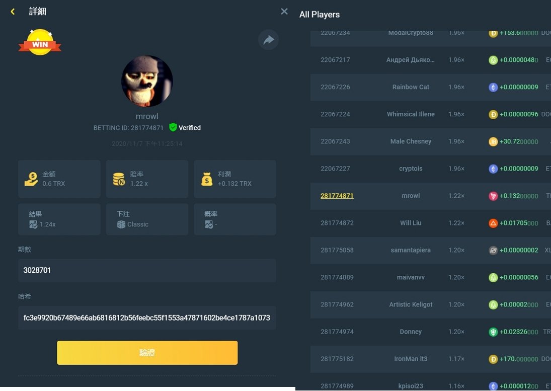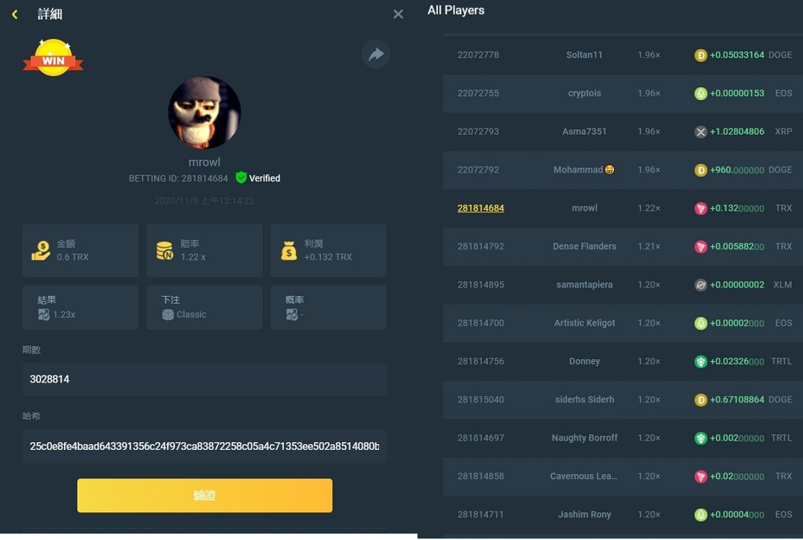 真是的 Posted November 6, 2020 Share Posted November 6, 2020 時間:台北時間 2020/11/7 20:00 ~ 2020/11/8 20:00。 參加資格:玩家需活躍於中文聊天室、並且是大家熟知的中文玩家。(突然冒出來沒人認識的帳號、或長期不參與中文聊天的帳號皆不符資格)。 挑戰遊戲:爆點 (classic)。 最低下注金額:請參考下表,僅限使用表定的幣種、金額不得低於表定的數量。 挑戰目標:下注金額依照上表規定,挑戰成為最後一名成功逃跑的幸運兒 (包含與其它玩家並列最後同時成功逃跑者),並且你的逃跑倍數不得高於 5x (含)。參與挑戰並達成目標者、需在下方回覆此討論串、粘貼螢幕截圖、並提供該局 Game-ID 才算是完成整個任務。 達標獎金:每一次達標得獎金 0.00035 ETH,玩家可以重覆多次挑戰、獎金可累計。 名額:不限名額。此活動總獎金 0.1 ETH、依玩家回覆文章順序統計發放、發完為止。若有剩餘獎金、將留待以後活動使用 獎金發放:將於活動結束後統計並確認資料無誤以後發放獎金。 以上活動訊息如有缺漏將於討論串當中隨時補充更新、請密切關注。 Link to comment Share on other sites More sharing options...