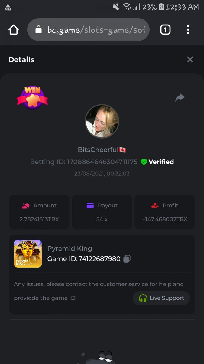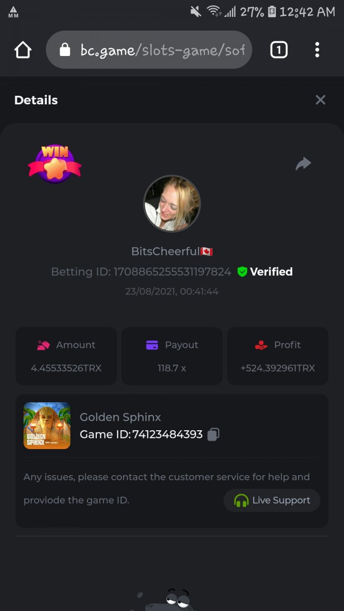 FkArndFndOut Posted August 23, 2021 Share Posted August 23, 2021 **1) GOLDEN SPHYNX 524.4 TRX = $47 USD **2) PYRAMID KING 147.5 TRX = $13.20 USD **3) EGYPTIAN 0.00059840BTC = $30 USD ID# 19043223565574765 ALL CONVERSIONS ACCORDING TO COINGECKO AT THE TIME OF WIN CAUSE I WAS TOO STUPID TO GET THE PROPER SCREEN SHOT ..... I KNOW, I MADE A SHMUCK MOVE.... SORRY DASH, I LOVE YA again, sorry for all the work I cause for you by not getting the right screenshots, Ill let ya call in a no questions asked favor anytime for your efforts....you're the best Link to comment Share on other sites More sharing options...