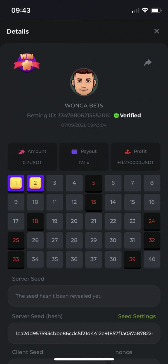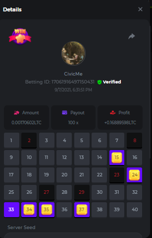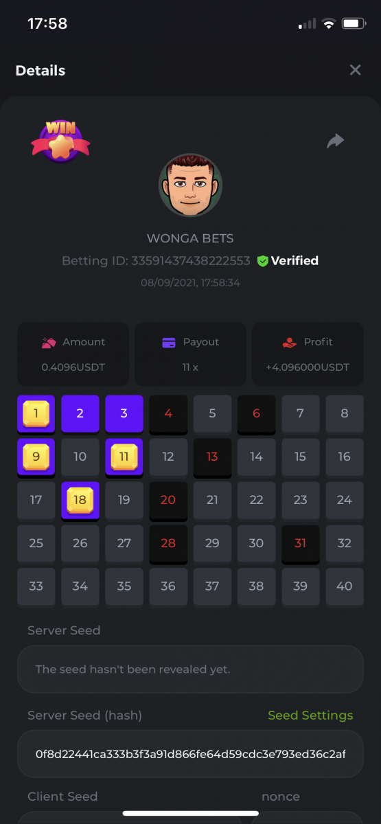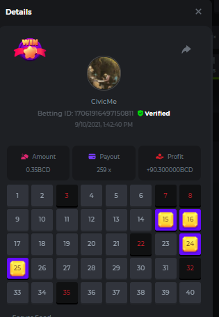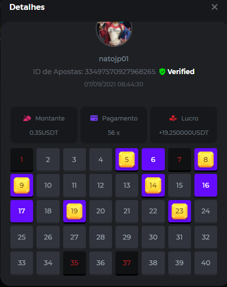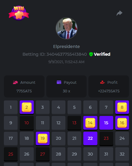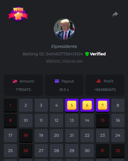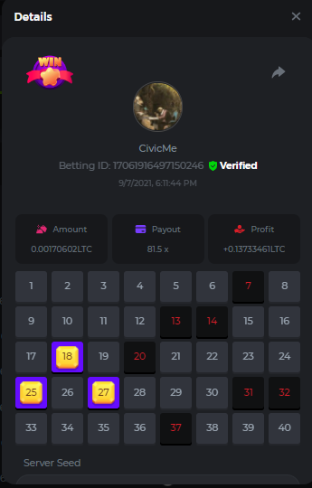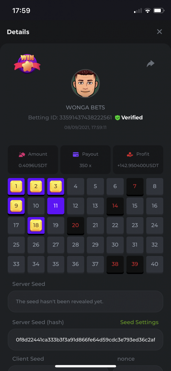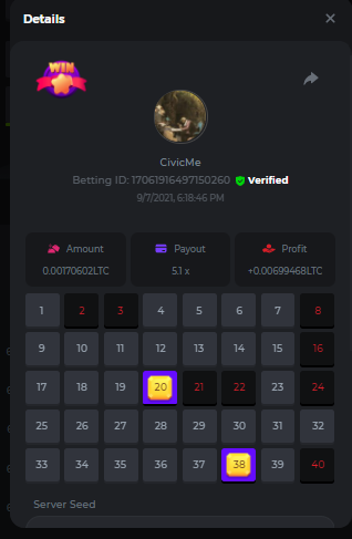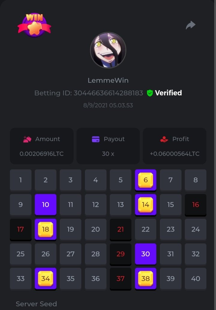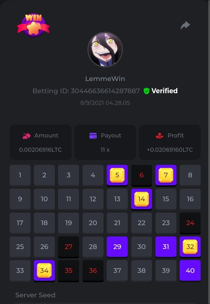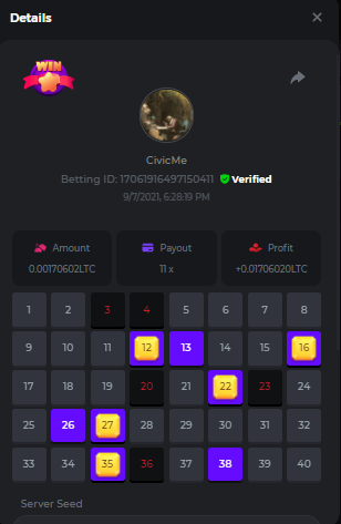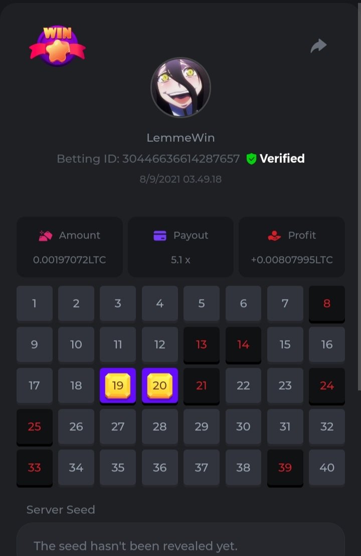 Mongthehung Posted September 7, 2021 Share Posted September 7, 2021 13 hours ago, digitaldash said: TOP TIER CHALLENGE #3 Starts: 06:00, September 7 GMTEnds: 06:00, September 14 GMT Welcome back! You may be wondering why this challenge is only $2,000. We'll be having two separate challenges going on this week, with the second part coming very soon so keep a lookout for that! This week, we have a KENO challenge! What's the Challenge? Complete as many of the following 20 payouts on either KENO Multiplayer or KENO Single Player. You must hit a MINIMUM of 5 of the payouts to qualify! 5.10x - 11x - 17.1x - 26x - 30x - 56x - 67x - 81.5x - 100x - 180x - 259x - 270x - 390x - 450x - 500x - 600x - 710x - 800x - 900x - 1000x Each payout you hit above counts as 1 point, with a maximum of 20 points. If there is a tie, the player with the higher total bet amount (in USD) shall be the winner. The payouts must be EXACT hits (56x and 50x are not the same) - if you can't find a payout, try changing the risk level to medium or high. Minimum VIP Tier Must be VIP10 or higher in order to enter this challenge. Minimum Bet Size $0.35 equivalent (please check the individual coin amounts below) Eligible Coins All coins are eligible (excluding JB) Available Prizes 1st Place......$500 2nd Place.....$375 3rd Place.....$250 4th Place......$125 5th-25th......$25 Participation Pool.......$250 split equally How to Enter To enter, copy the bet ID of the bet you'd like to submit Once you've copied it, post it as a reply to this thread like so: Betting ID: 1708854428417660423 In the same post, upload a screenshot of your win by clicking the game ID WITH VIEW IN USD mode ENABLED (accessible at the bottom of dropdown menu for your wallet up top. This way, we can ensure that your bet indeed met the minimum requirement at the time of placing it: Please combine all of your hits together in a SINGLE post. Edit, don't create a new post. Bets must be posted within 24 hours of placing bet in order to keep things fair for everyone. Bets must be made during the specified time windows stated above. This thread will lock automatically when the time period is over. One (1) entry per household. Anyone found to be attempting to win multiple prizes will be disqualified from this challenge as well as all future challenges. Furthermore, you will go on the WALL OF SHAME for all to see that you are a scam! Failure to follow instructions will result in your submission being null and void. And let the races begin! Good luck everyone, look forward to seeing who comes out on top this week Link to comment Share on other sites More sharing options...