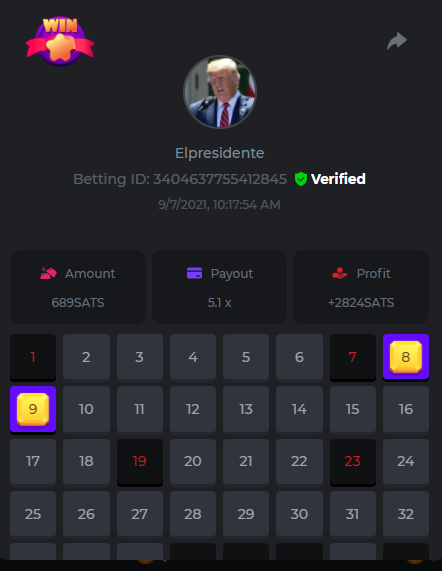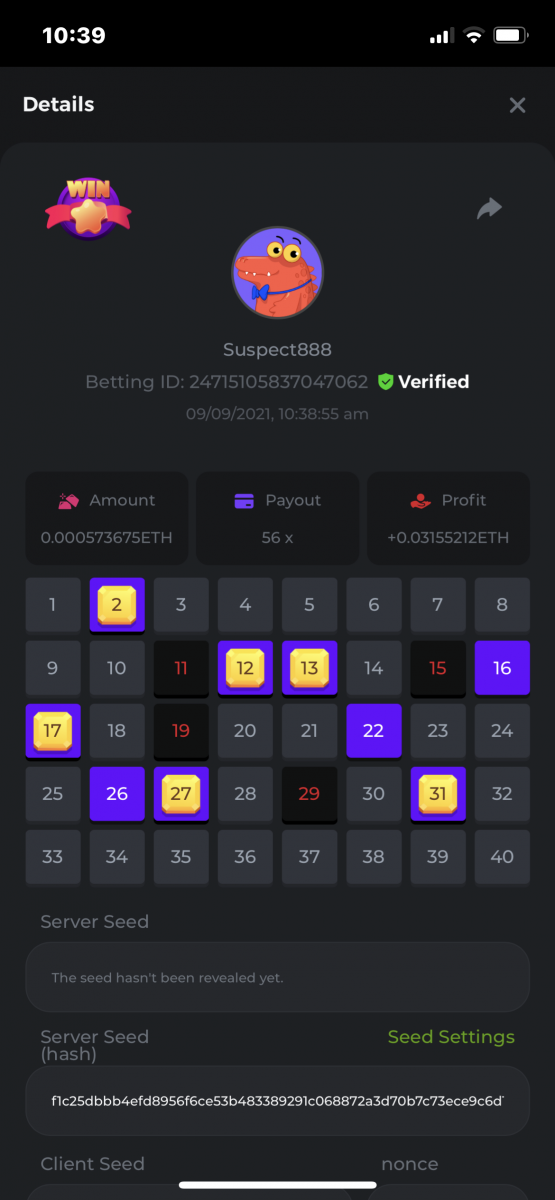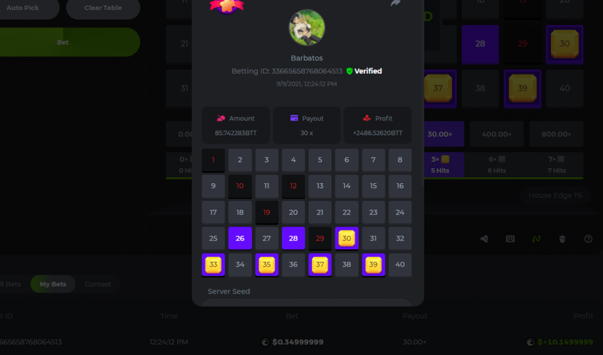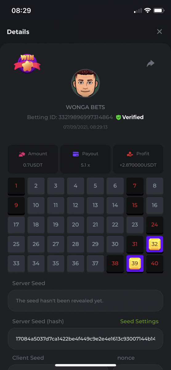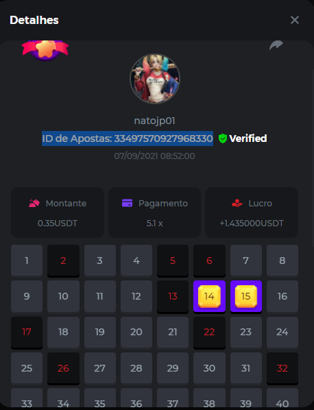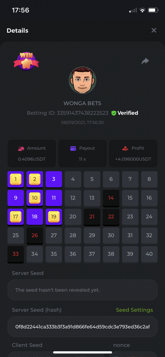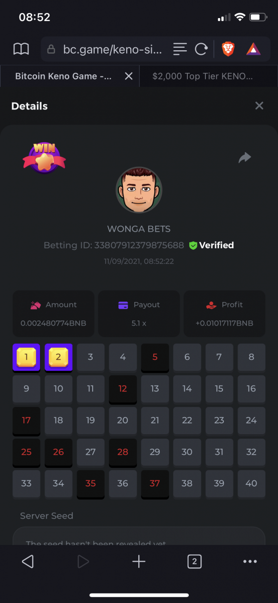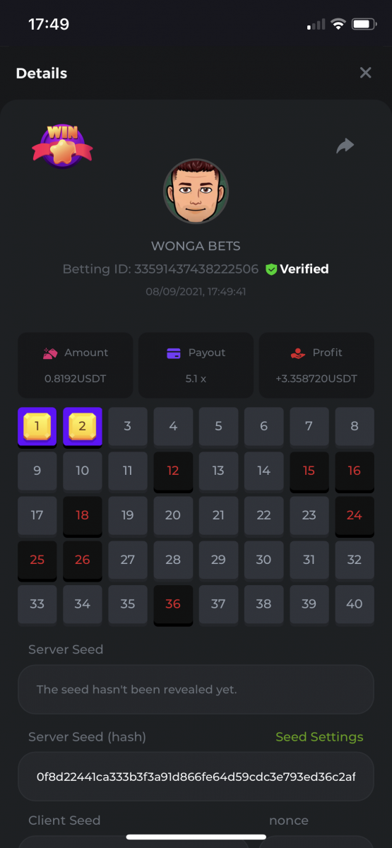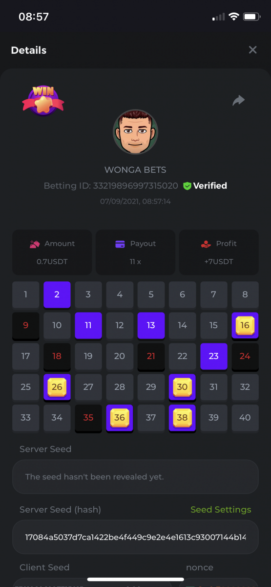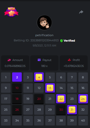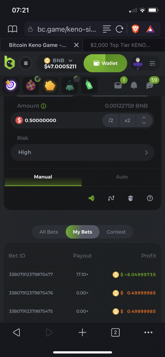 Mongthehung Posted September 7, 2021 Share Posted September 7, 2021 13 hours ago, digitaldash said: TOP TIER CHALLENGE #3 Starts: 06:00, September 7 GMTEnds: 06:00, September 14 GMT Welcome back! You may be wondering why this challenge is only $2,000. We'll be having two separate challenges going on this week, with the second part coming very soon so keep a lookout for that! This week, we have a KENO challenge! What's the Challenge? Complete as many of the following 20 payouts on either KENO Multiplayer or KENO Single Player. You must hit a MINIMUM of 5 of the payouts to qualify! 5.10x - 11x - 17.1x - 26x - 30x - 56x - 67x - 81.5x - 100x - 180x - 259x - 270x - 390x - 450x - 500x - 600x - 710x - 800x - 900x - 1000x Each payout you hit above counts as 1 point, with a maximum of 20 points. If there is a tie, the player with the higher total bet amount (in USD) shall be the winner. The payouts must be EXACT hits (56x and 50x are not the same) - if you can't find a payout, try changing the risk level to medium or high. Minimum VIP Tier Must be VIP10 or higher in order to enter this challenge. Minimum Bet Size $0.35 equivalent (please check the individual coin amounts below) Eligible Coins All coins are eligible (excluding JB) Available Prizes 1st Place......$500 2nd Place.....$375 3rd Place.....$250 4th Place......$125 5th-25th......$25 Participation Pool.......$250 split equally How to Enter To enter, copy the bet ID of the bet you'd like to submit Once you've copied it, post it as a reply to this thread like so: Betting ID: 1708854428417660423 In the same post, upload a screenshot of your win by clicking the game ID WITH VIEW IN USD mode ENABLED (accessible at the bottom of dropdown menu for your wallet up top. This way, we can ensure that your bet indeed met the minimum requirement at the time of placing it: Please combine all of your hits together in a SINGLE post. Edit, don't create a new post. Bets must be posted within 24 hours of placing bet in order to keep things fair for everyone. Bets must be made during the specified time windows stated above. This thread will lock automatically when the time period is over. One (1) entry per household. Anyone found to be attempting to win multiple prizes will be disqualified from this challenge as well as all future challenges. Furthermore, you will go on the WALL OF SHAME for all to see that you are a scam! Failure to follow instructions will result in your submission being null and void. And let the races begin! Good luck everyone, look forward to seeing who comes out on top this week Link to comment Share on other sites More sharing options...