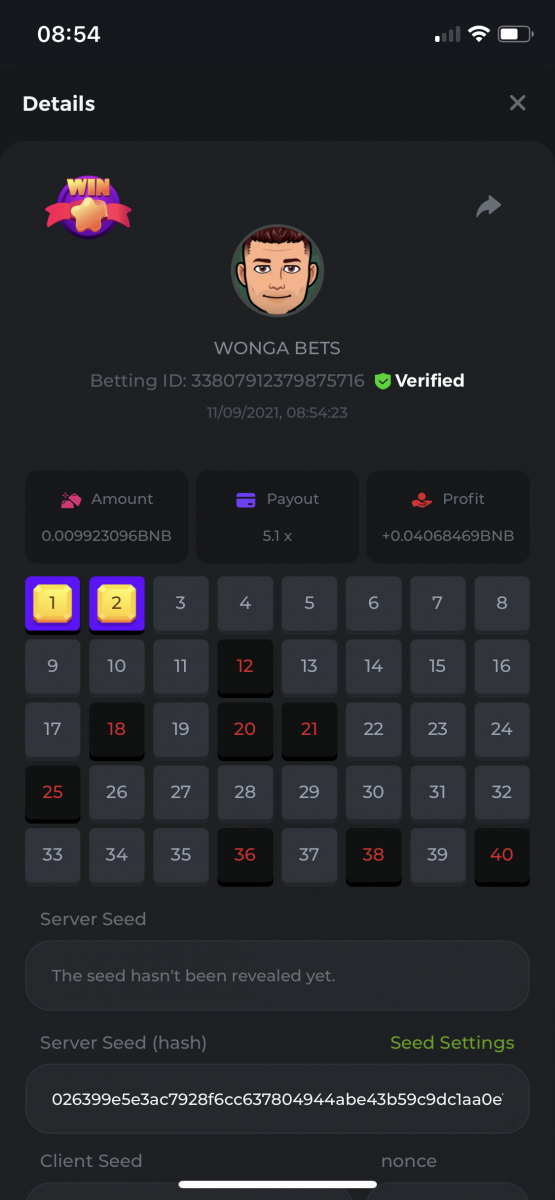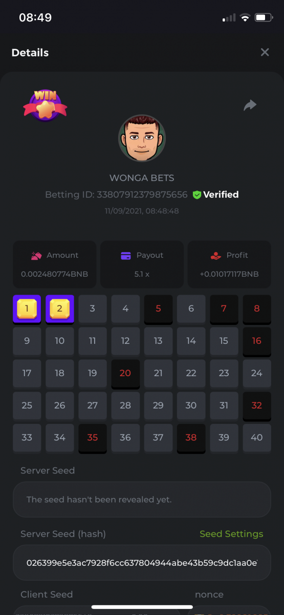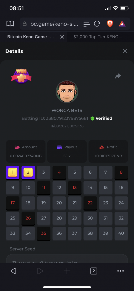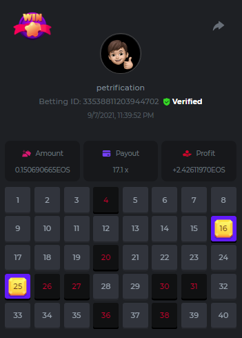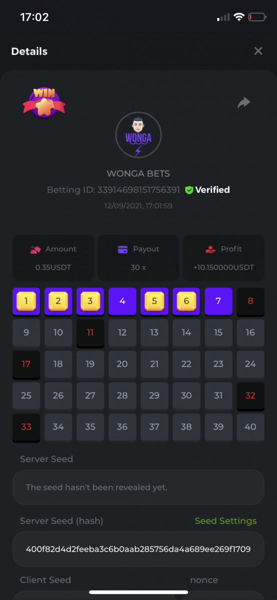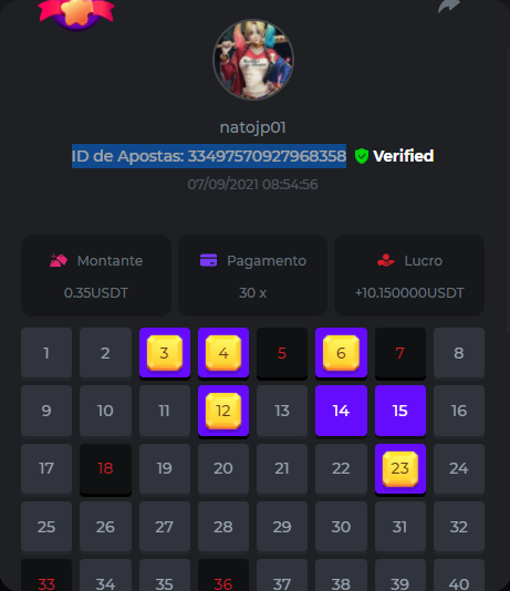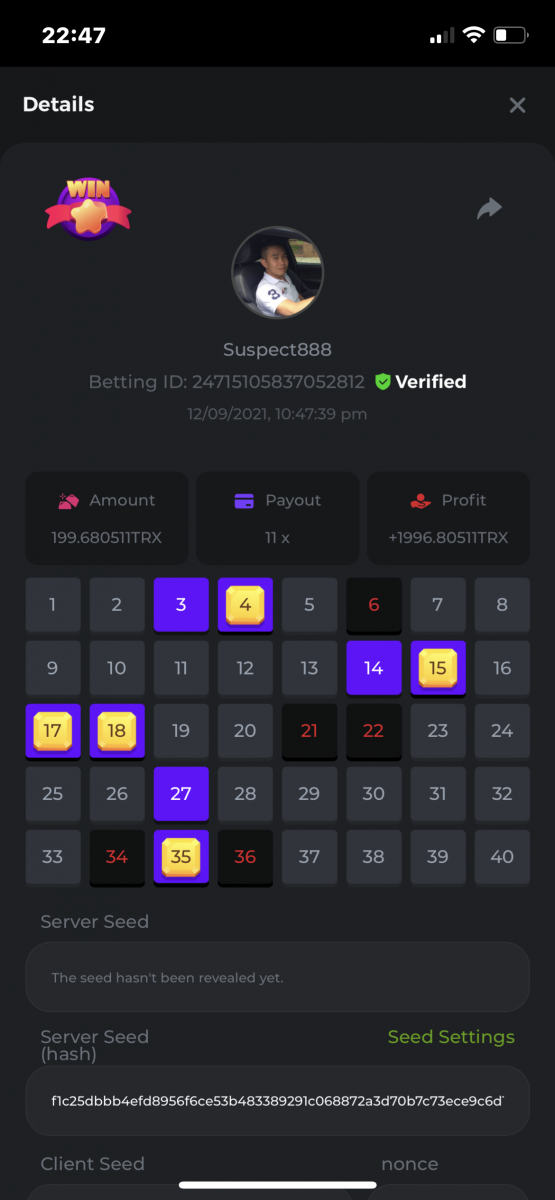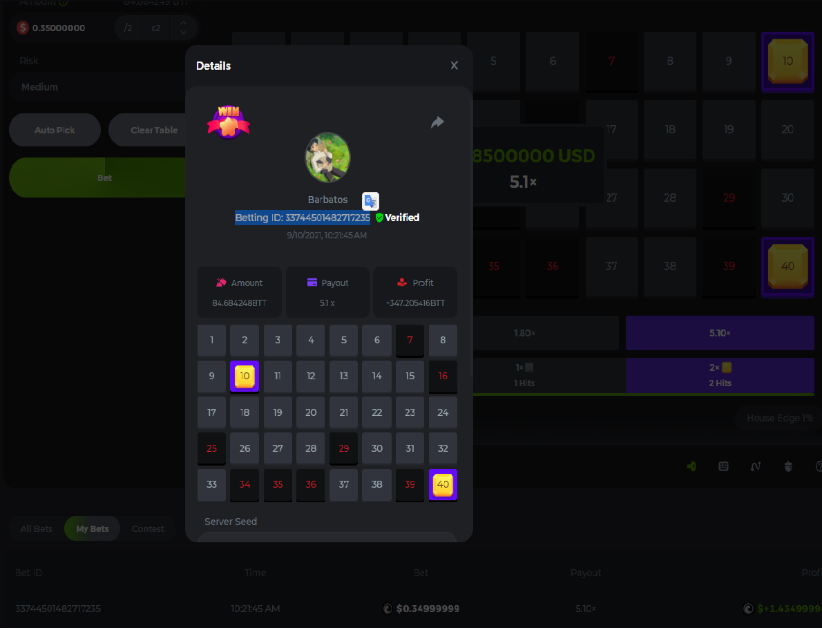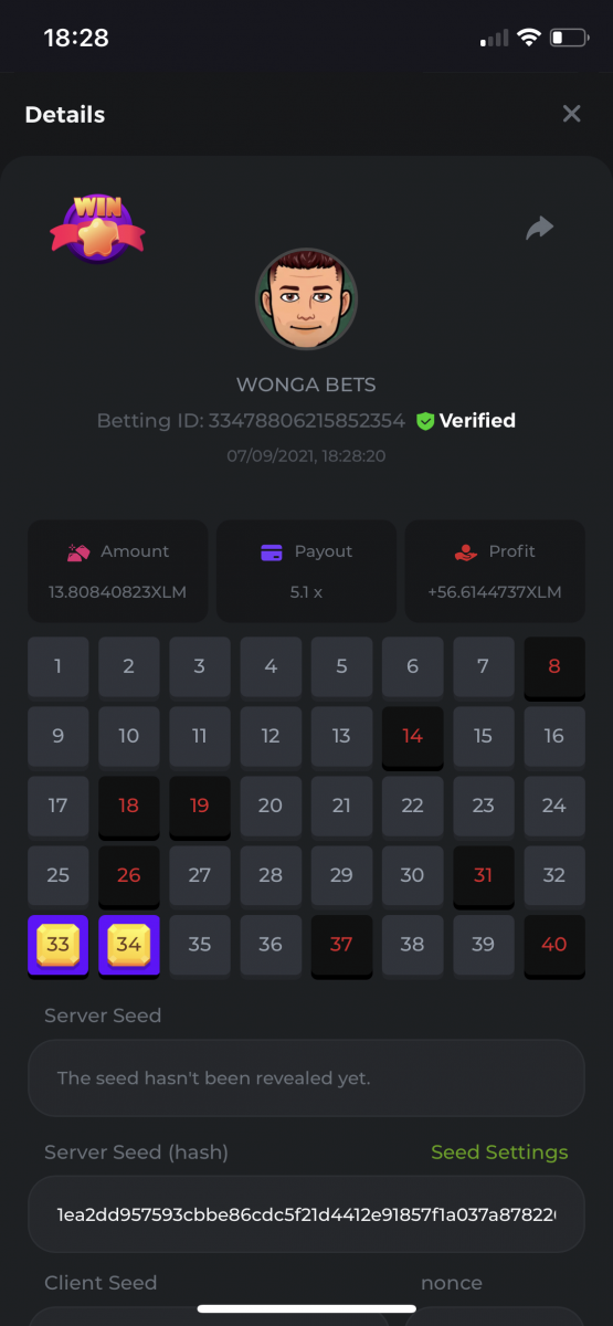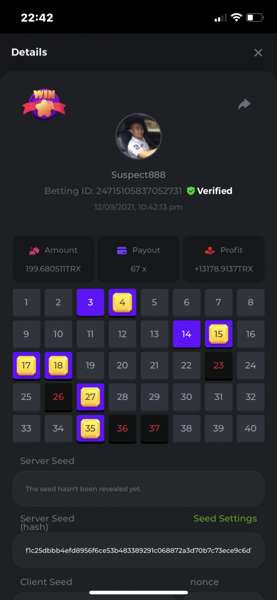 Mongthehung Posted September 7, 2021 Share Posted September 7, 2021 13 hours ago, digitaldash said: TOP TIER CHALLENGE #3 Starts: 06:00, September 7 GMTEnds: 06:00, September 14 GMT Welcome back! You may be wondering why this challenge is only $2,000. We'll be having two separate challenges going on this week, with the second part coming very soon so keep a lookout for that! This week, we have a KENO challenge! What's the Challenge? Complete as many of the following 20 payouts on either KENO Multiplayer or KENO Single Player. You must hit a MINIMUM of 5 of the payouts to qualify! 5.10x - 11x - 17.1x - 26x - 30x - 56x - 67x - 81.5x - 100x - 180x - 259x - 270x - 390x - 450x - 500x - 600x - 710x - 800x - 900x - 1000x Each payout you hit above counts as 1 point, with a maximum of 20 points. If there is a tie, the player with the higher total bet amount (in USD) shall be the winner. The payouts must be EXACT hits (56x and 50x are not the same) - if you can't find a payout, try changing the risk level to medium or high. Minimum VIP Tier Must be VIP10 or higher in order to enter this challenge. Minimum Bet Size $0.35 equivalent (please check the individual coin amounts below) Eligible Coins All coins are eligible (excluding JB) Available Prizes 1st Place......$500 2nd Place.....$375 3rd Place.....$250 4th Place......$125 5th-25th......$25 Participation Pool.......$250 split equally How to Enter To enter, copy the bet ID of the bet you'd like to submit Once you've copied it, post it as a reply to this thread like so: Betting ID: 1708854428417660423 In the same post, upload a screenshot of your win by clicking the game ID WITH VIEW IN USD mode ENABLED (accessible at the bottom of dropdown menu for your wallet up top. This way, we can ensure that your bet indeed met the minimum requirement at the time of placing it: Please combine all of your hits together in a SINGLE post. Edit, don't create a new post. Bets must be posted within 24 hours of placing bet in order to keep things fair for everyone. Bets must be made during the specified time windows stated above. This thread will lock automatically when the time period is over. One (1) entry per household. Anyone found to be attempting to win multiple prizes will be disqualified from this challenge as well as all future challenges. Furthermore, you will go on the WALL OF SHAME for all to see that you are a scam! Failure to follow instructions will result in your submission being null and void. And let the races begin! Good luck everyone, look forward to seeing who comes out on top this week Link to comment Share on other sites More sharing options...