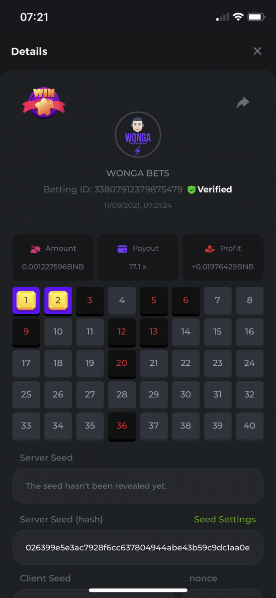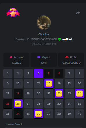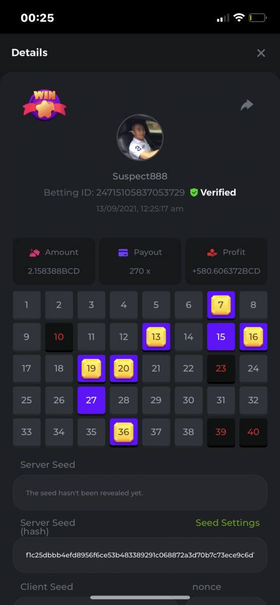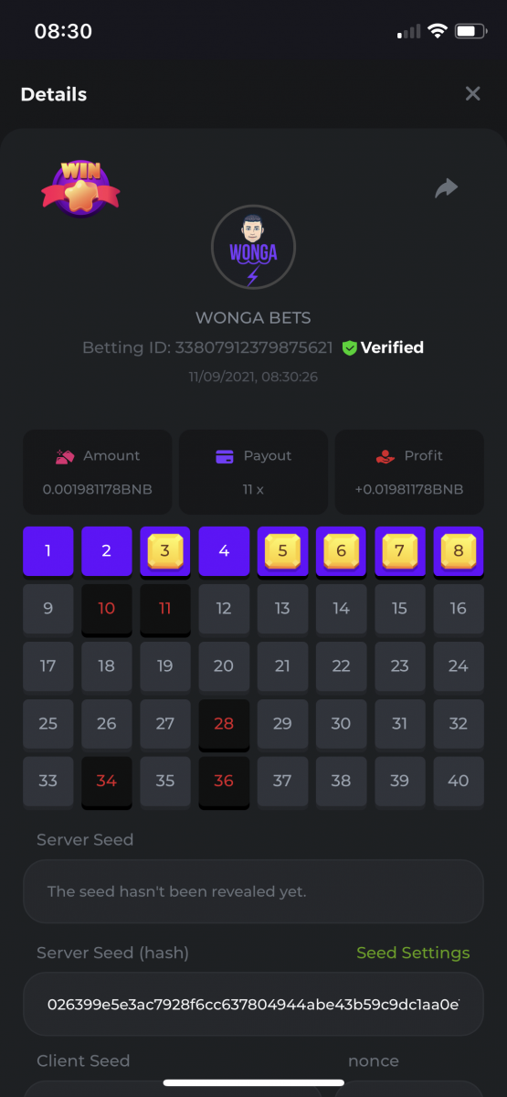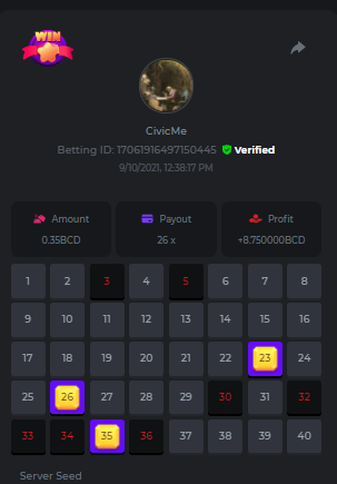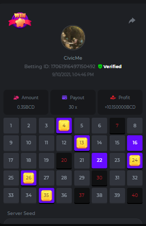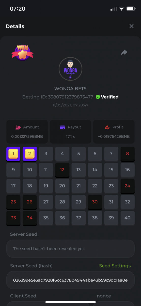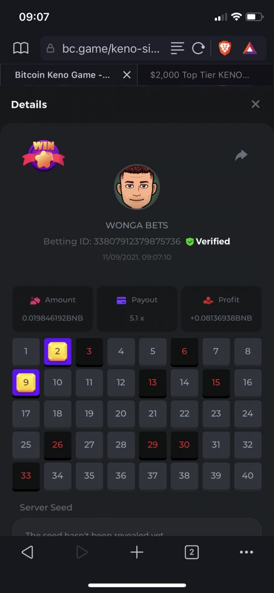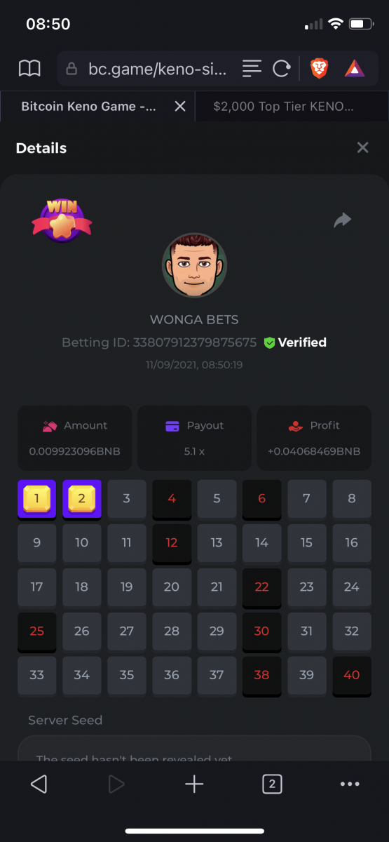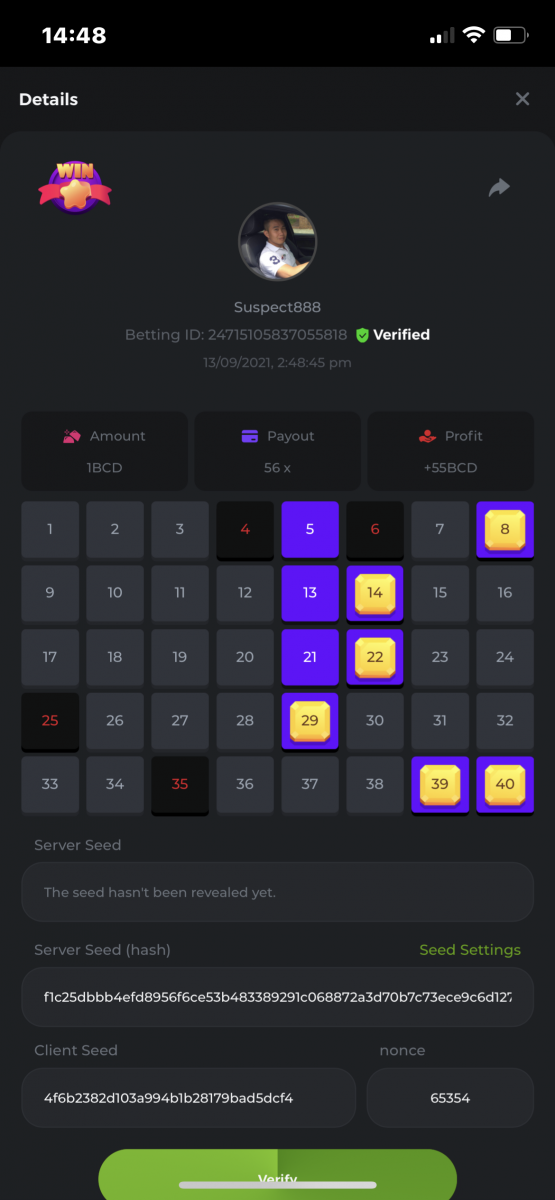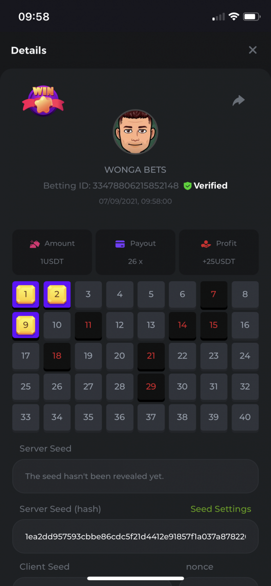 Mongthehung Posted September 7, 2021 Share Posted September 7, 2021 13 hours ago, digitaldash said: TOP TIER CHALLENGE #3 Starts: 06:00, September 7 GMTEnds: 06:00, September 14 GMT Welcome back! You may be wondering why this challenge is only $2,000. We'll be having two separate challenges going on this week, with the second part coming very soon so keep a lookout for that! This week, we have a KENO challenge! What's the Challenge? Complete as many of the following 20 payouts on either KENO Multiplayer or KENO Single Player. You must hit a MINIMUM of 5 of the payouts to qualify! 5.10x - 11x - 17.1x - 26x - 30x - 56x - 67x - 81.5x - 100x - 180x - 259x - 270x - 390x - 450x - 500x - 600x - 710x - 800x - 900x - 1000x Each payout you hit above counts as 1 point, with a maximum of 20 points. If there is a tie, the player with the higher total bet amount (in USD) shall be the winner. The payouts must be EXACT hits (56x and 50x are not the same) - if you can't find a payout, try changing the risk level to medium or high. Minimum VIP Tier Must be VIP10 or higher in order to enter this challenge. Minimum Bet Size $0.35 equivalent (please check the individual coin amounts below) Eligible Coins All coins are eligible (excluding JB) Available Prizes 1st Place......$500 2nd Place.....$375 3rd Place.....$250 4th Place......$125 5th-25th......$25 Participation Pool.......$250 split equally How to Enter To enter, copy the bet ID of the bet you'd like to submit Once you've copied it, post it as a reply to this thread like so: Betting ID: 1708854428417660423 In the same post, upload a screenshot of your win by clicking the game ID WITH VIEW IN USD mode ENABLED (accessible at the bottom of dropdown menu for your wallet up top. This way, we can ensure that your bet indeed met the minimum requirement at the time of placing it: Please combine all of your hits together in a SINGLE post. Edit, don't create a new post. Bets must be posted within 24 hours of placing bet in order to keep things fair for everyone. Bets must be made during the specified time windows stated above. This thread will lock automatically when the time period is over. One (1) entry per household. Anyone found to be attempting to win multiple prizes will be disqualified from this challenge as well as all future challenges. Furthermore, you will go on the WALL OF SHAME for all to see that you are a scam! Failure to follow instructions will result in your submission being null and void. And let the races begin! Good luck everyone, look forward to seeing who comes out on top this week Link to comment Share on other sites More sharing options...