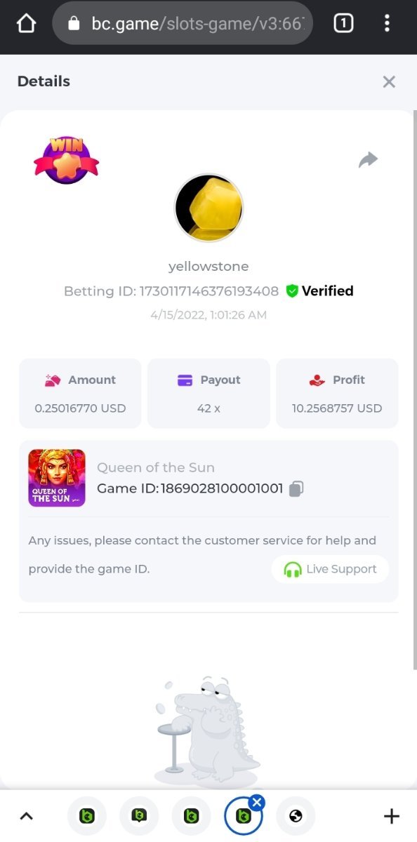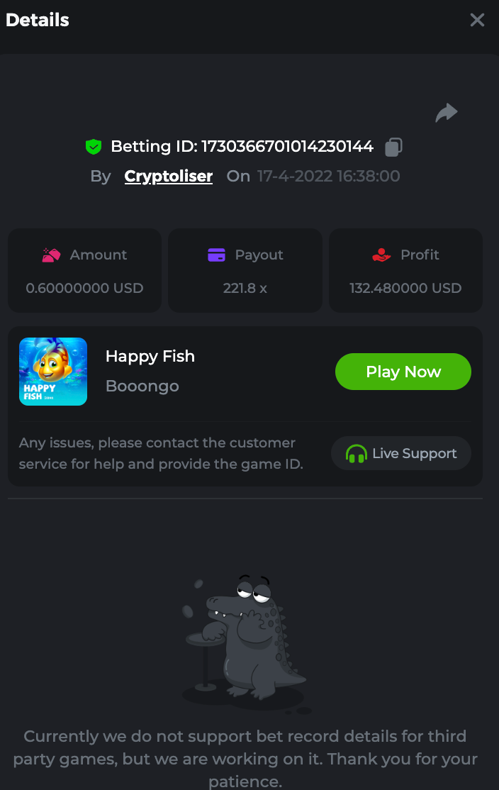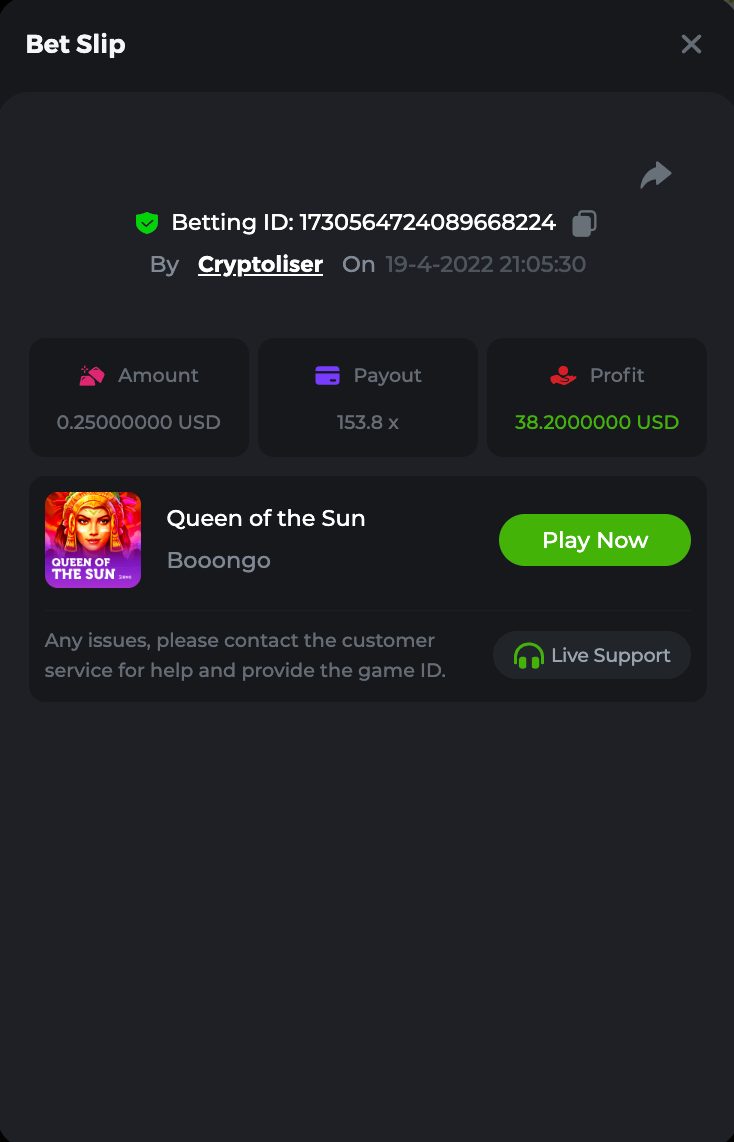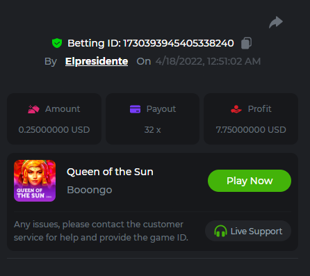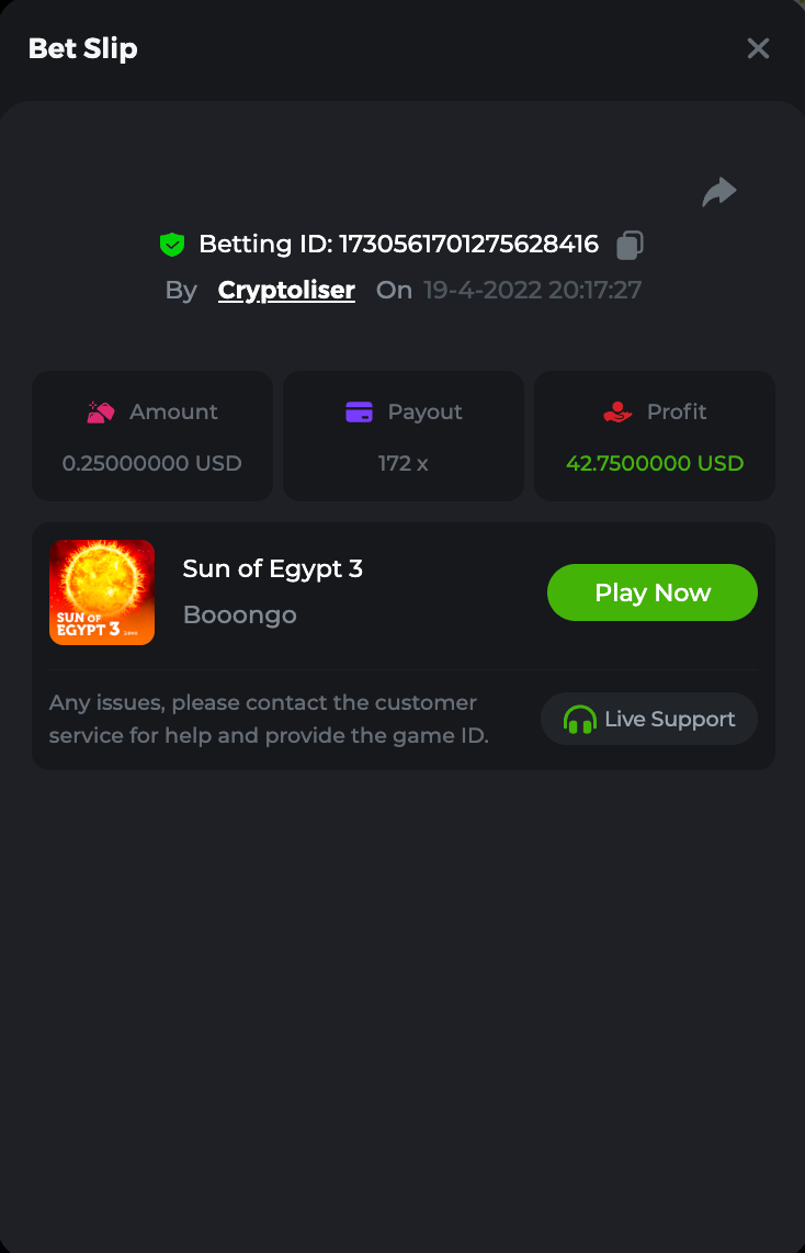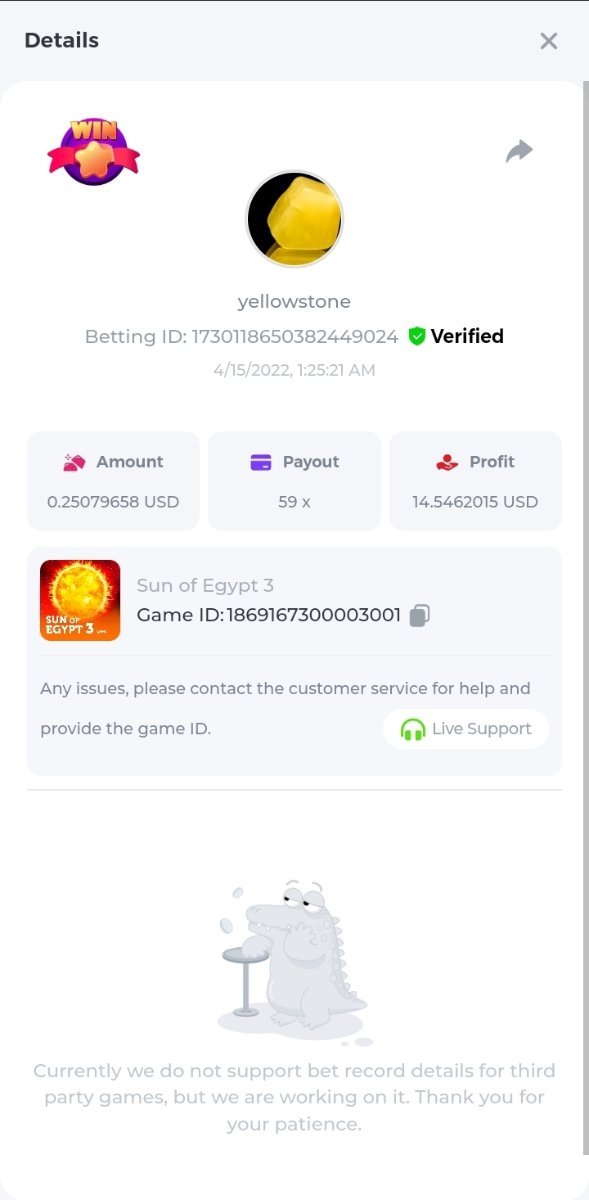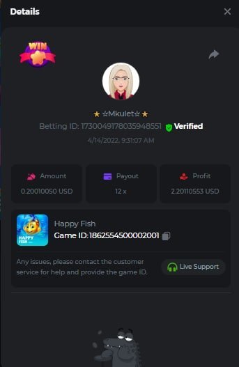 • In the same post, upload a screenshot of your win by clicking the game ID WITH VIEW IN USD mode ENABLED (accessible at the bottom of dropdown menu for your wallet up top, and Submit Reply. Done! This way, we can ensure that your bet indeed met the minimum requirement at the time of placing it: