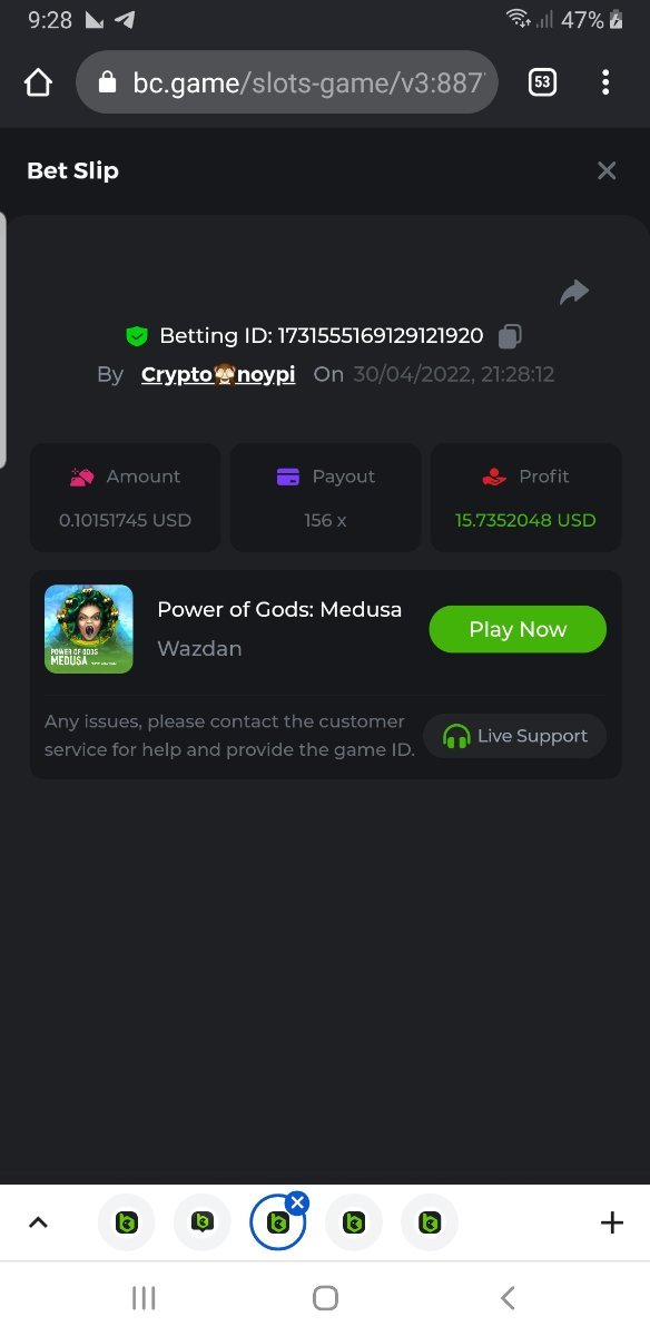 MeninaDtrap Posted May 1, 2022 Share Posted May 1, 2022 https://bc.game/sd/?sd=10JM7STT2U153N 92x $0.10 bet was the last spin so I got lucky just then https://bc.game/sd/?sd=10JM80LJ60QNTF 41.6x $0.20 bet https://bc.game/sd/?sd=10JM8GM5EM4T1V 58x $0.40 bet Link to comment Share on other sites More sharing options...