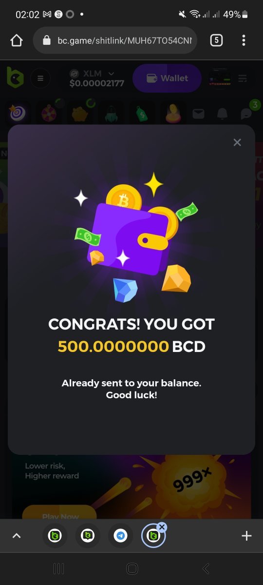 Bet just for low payout on crash but suddenly network loss and when my my phone network come it show i am win on 100x because crash go above 100x and that's my wow accident win moment152499697_100xhttps---bc.game-sd--sd10KBXXRPVQBPCJ.thumb.jpg.fb90305e1b94019de793145547720645.jpg